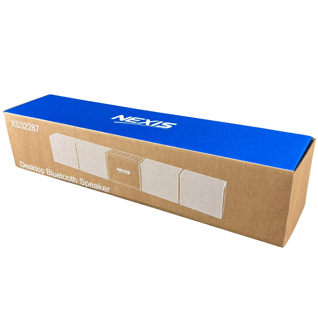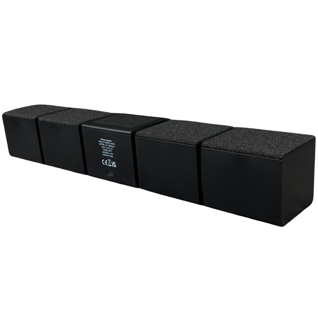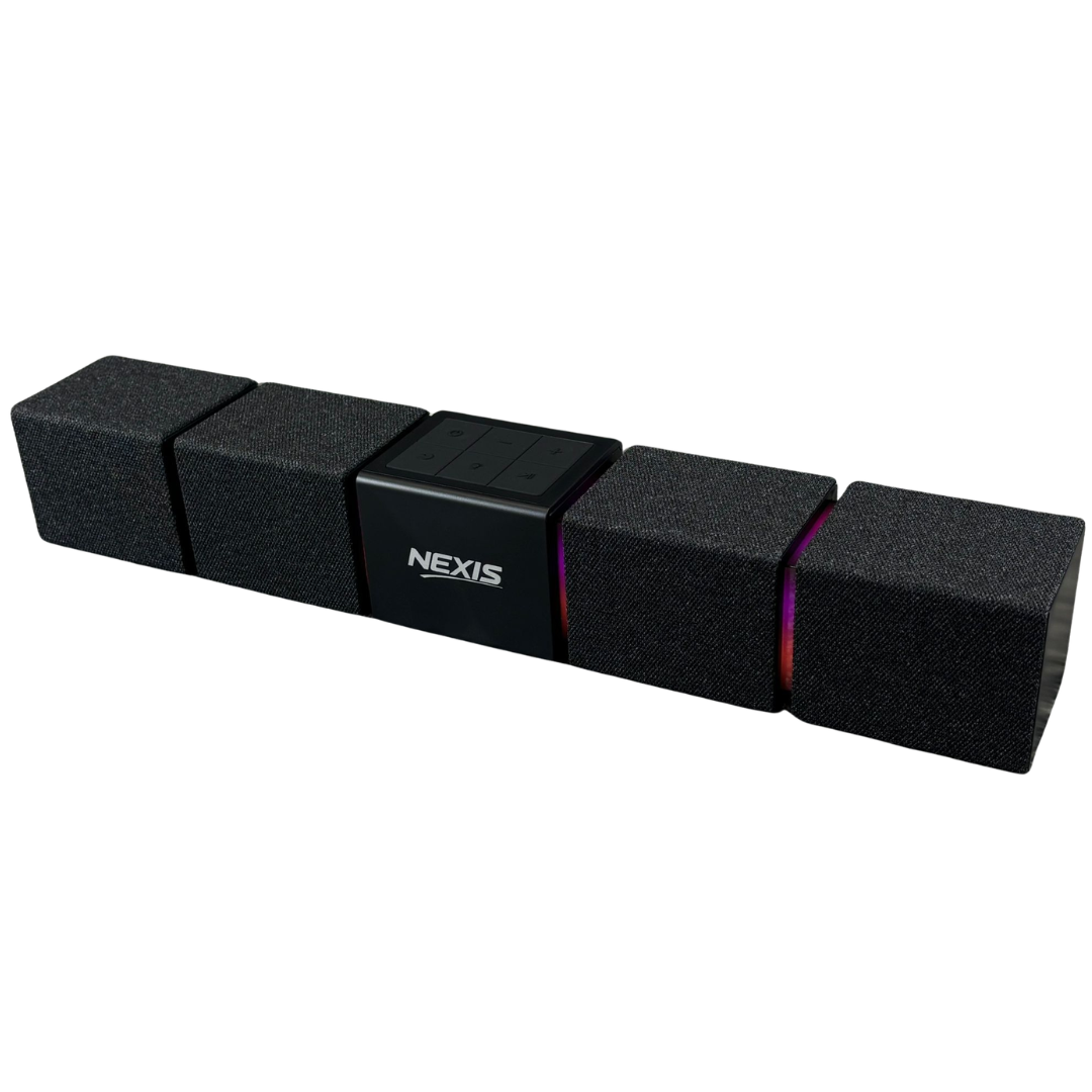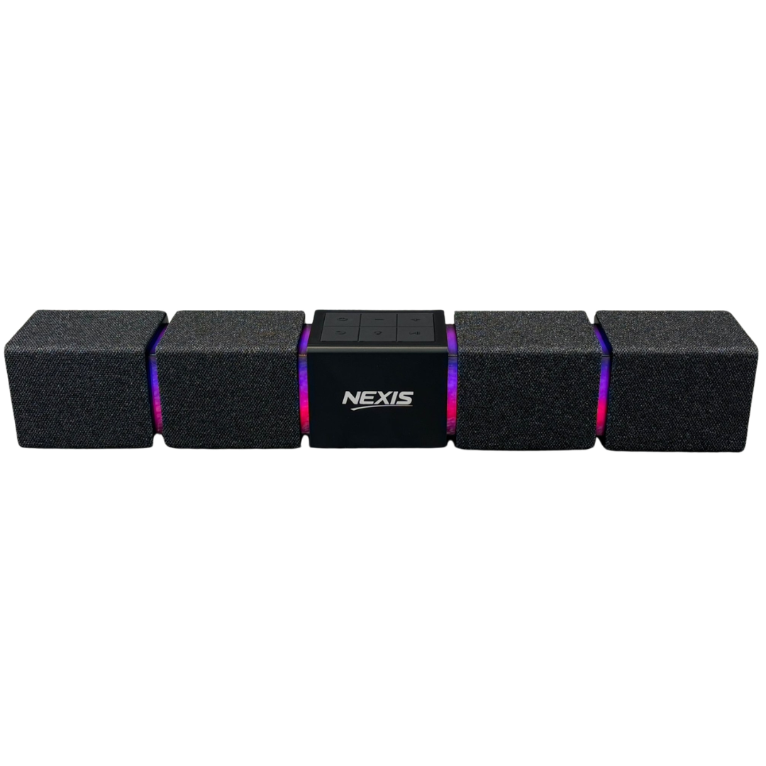A brand new Nexis portable wireless Bluetooth soundbar in a sleek black finish, designed to deliver an impressive audio upgrade for any desk or entertainment setup. The modern modular design creates a wider sound presence while maintaining a compact footprint, making it ideal for both home and office use. Subtle RGB lighting adds a contemporary touch, while the central control panel ensures simple and intuitive operation.