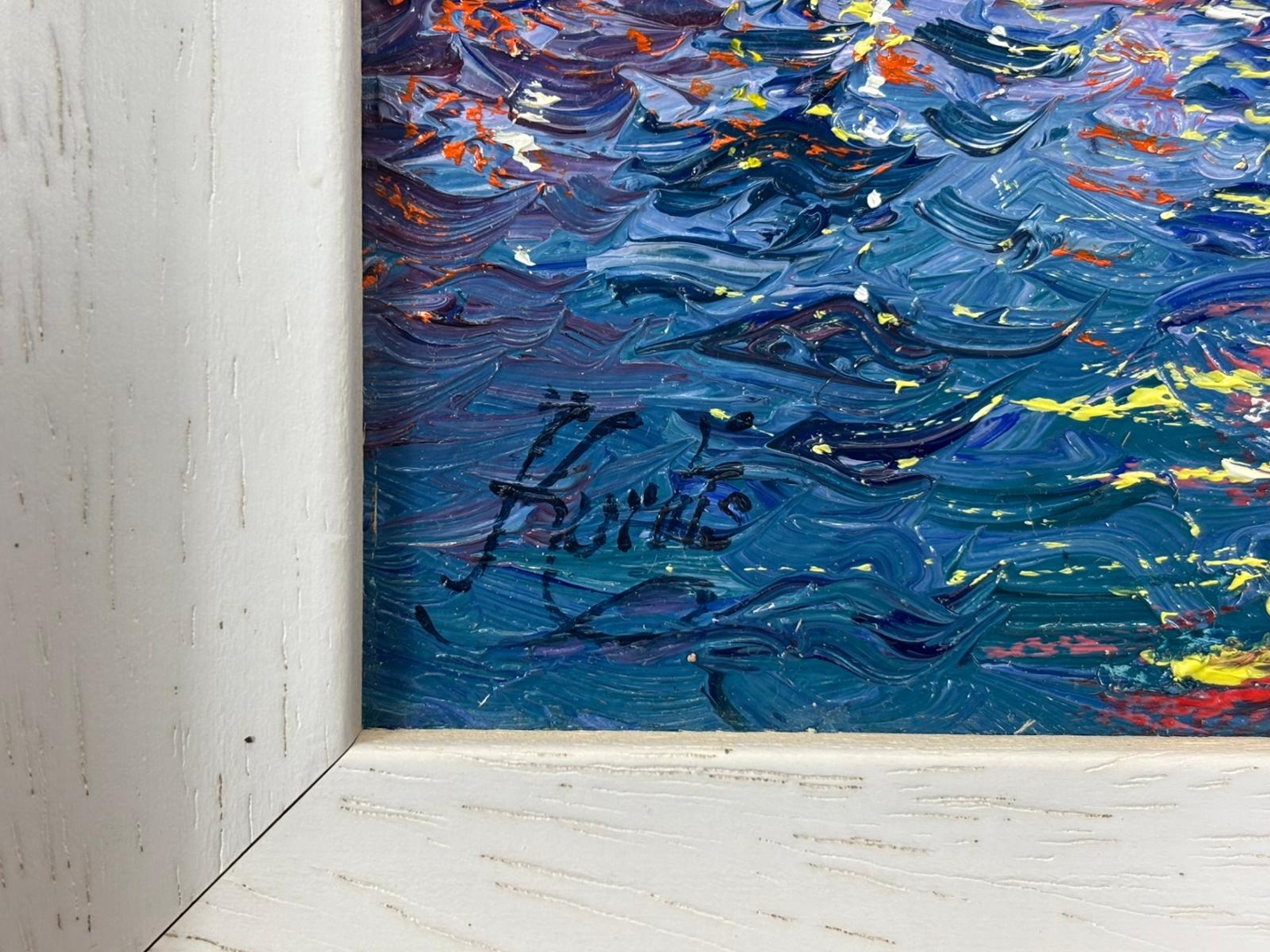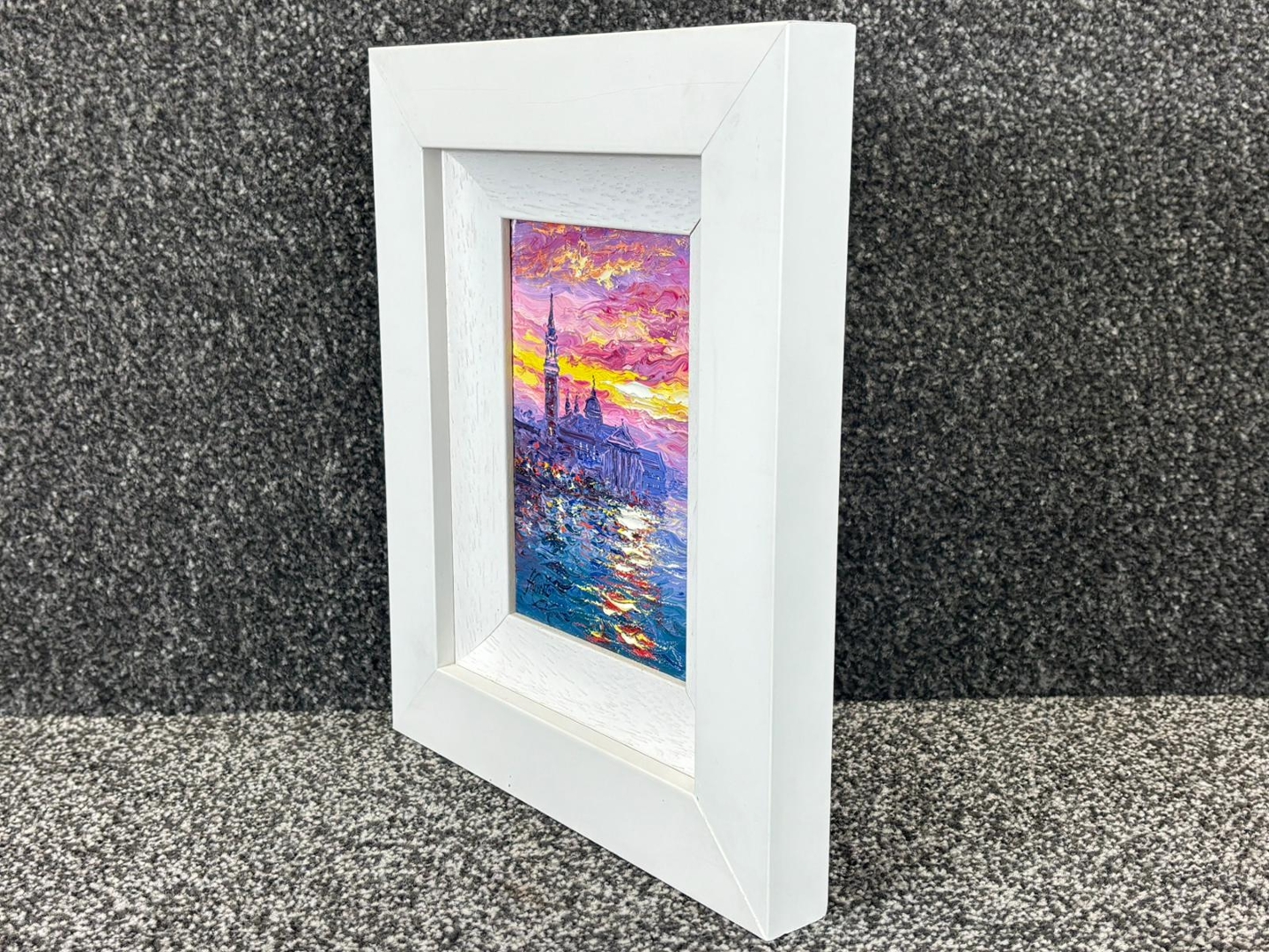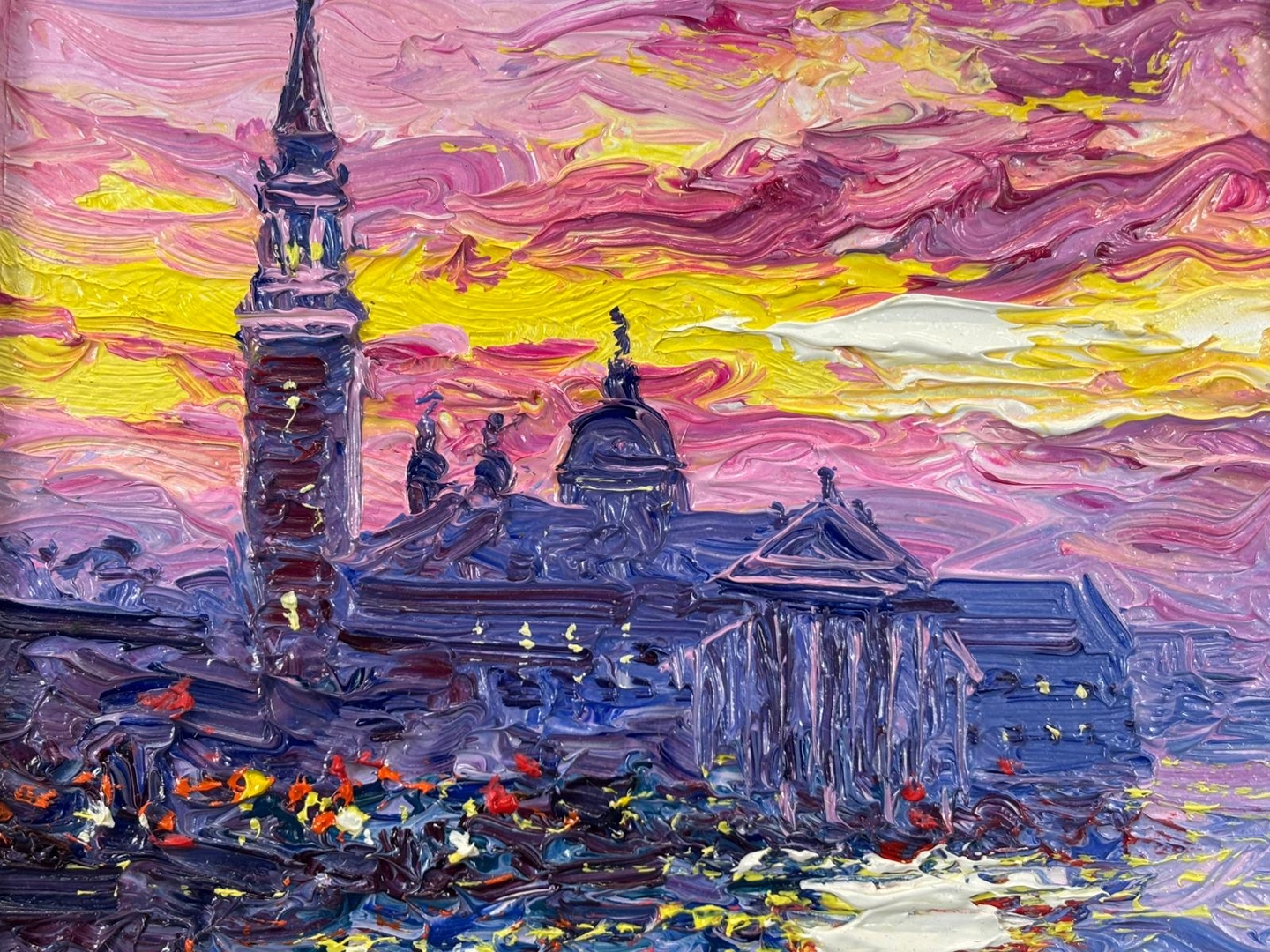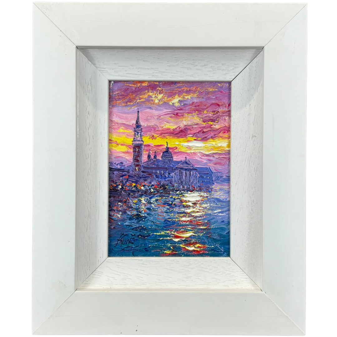A bold and energetic use of colour defines the piece, with thick impasto brushwork bringing the sky to life in vivid tones of pink, purple, and glowing gold. The reflections shimmer across the water in dynamic strokes, creating movement and depth, while the elegant silhouette of San Giorgio Maggiore anchors the composition with balance and clarity. The interplay of light and texture gives the painting a striking visual presence.