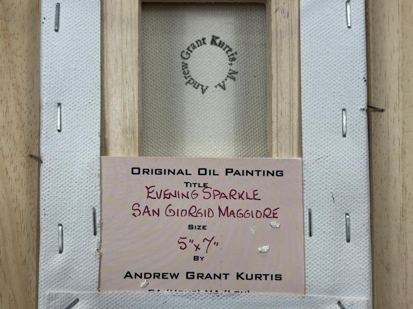 A framed original oil painting by Andrew Grant Kurtis titled 'Evening Sparkle San Giorgio Maggiore'. Approx 7" height, 5" width.