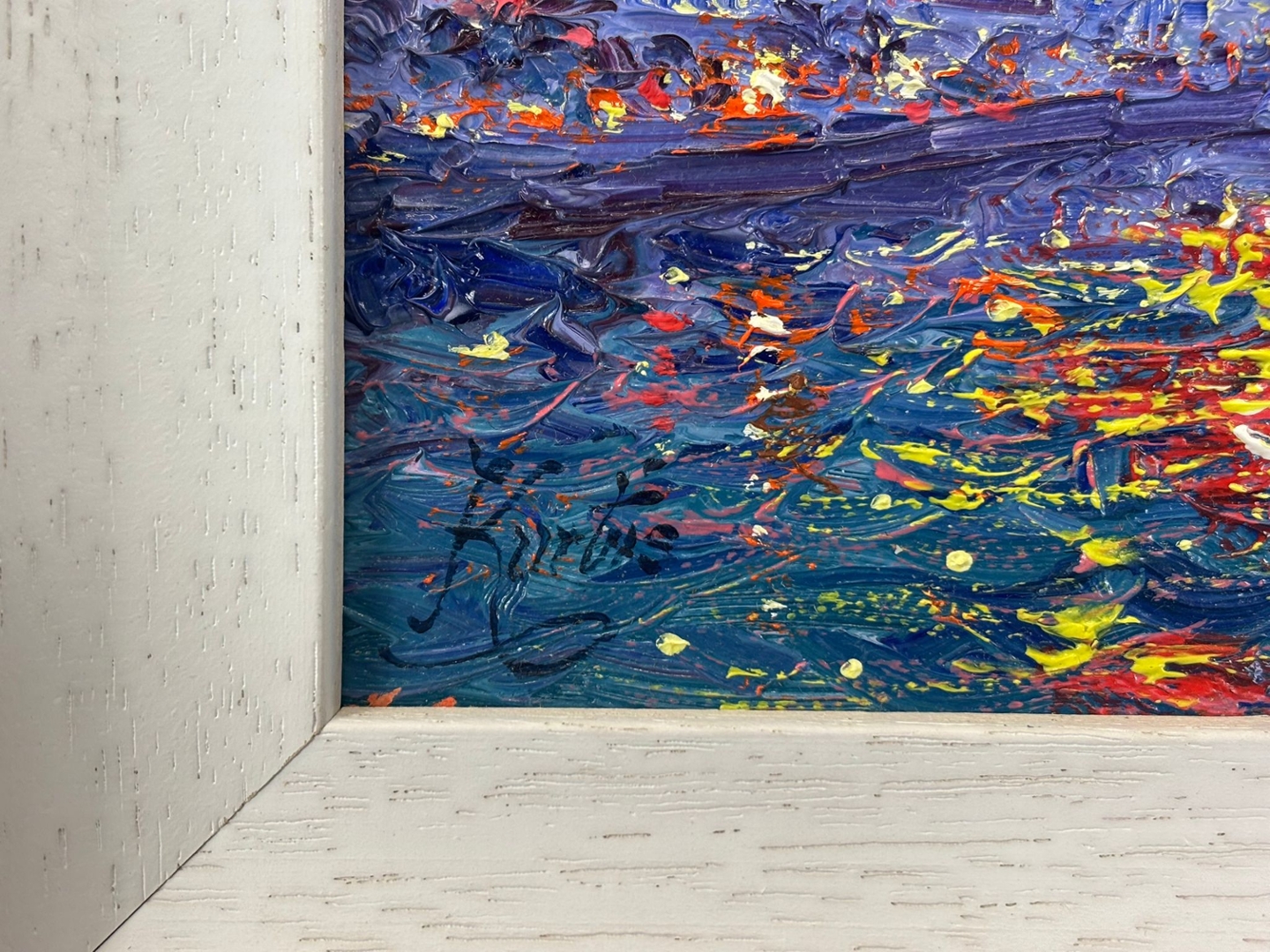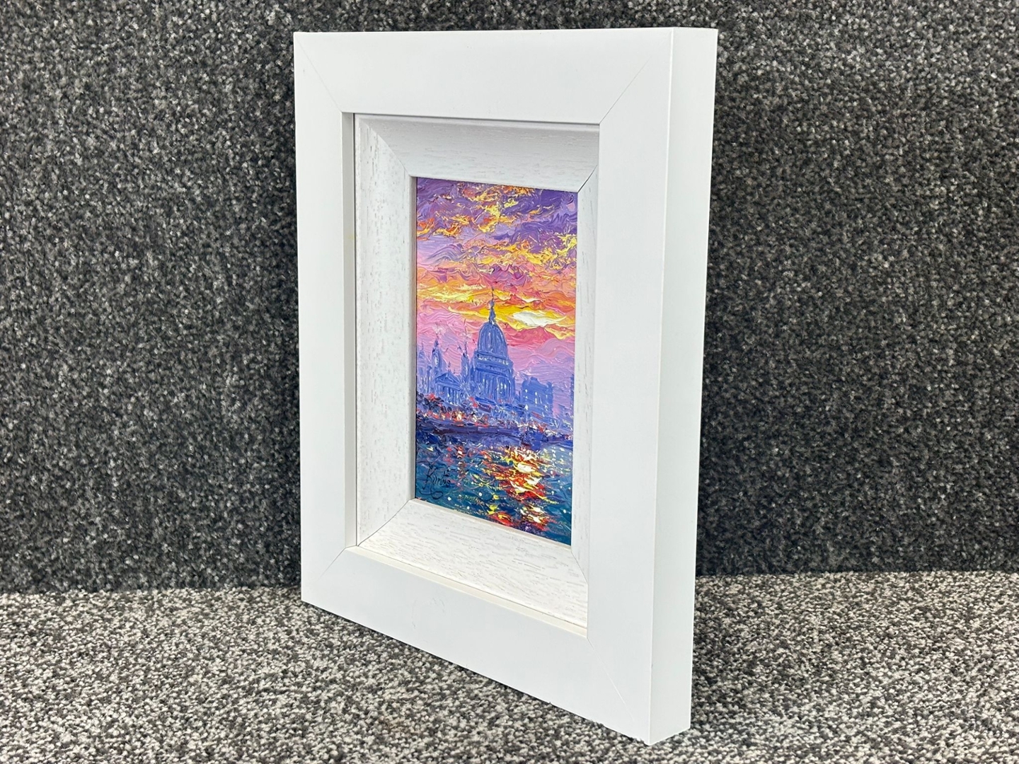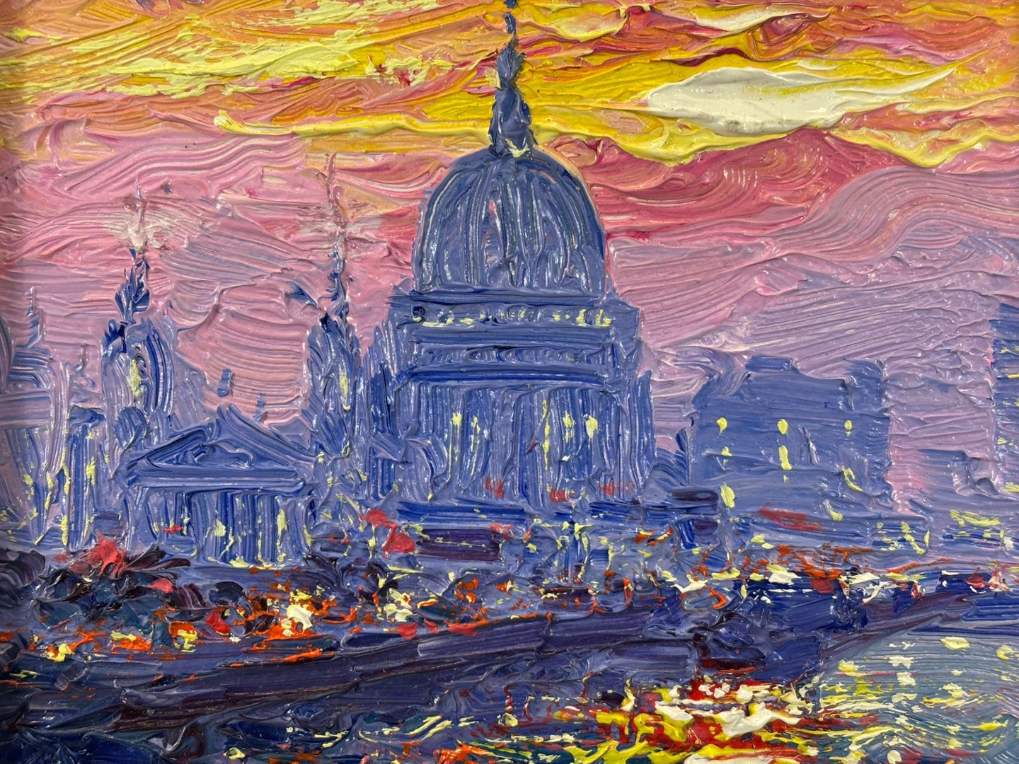 A dynamic interplay of colour defines the scene, with bold impasto brushwork bringing the sky to life in radiant hues of purple, pink, and gold. The shimmering reflections across the water echo these tones, creating depth and movement, while the cathedral’s silhouette stands with quiet authority at the centre. The balance between structure and abstraction gives the piece both energy and sophistication.