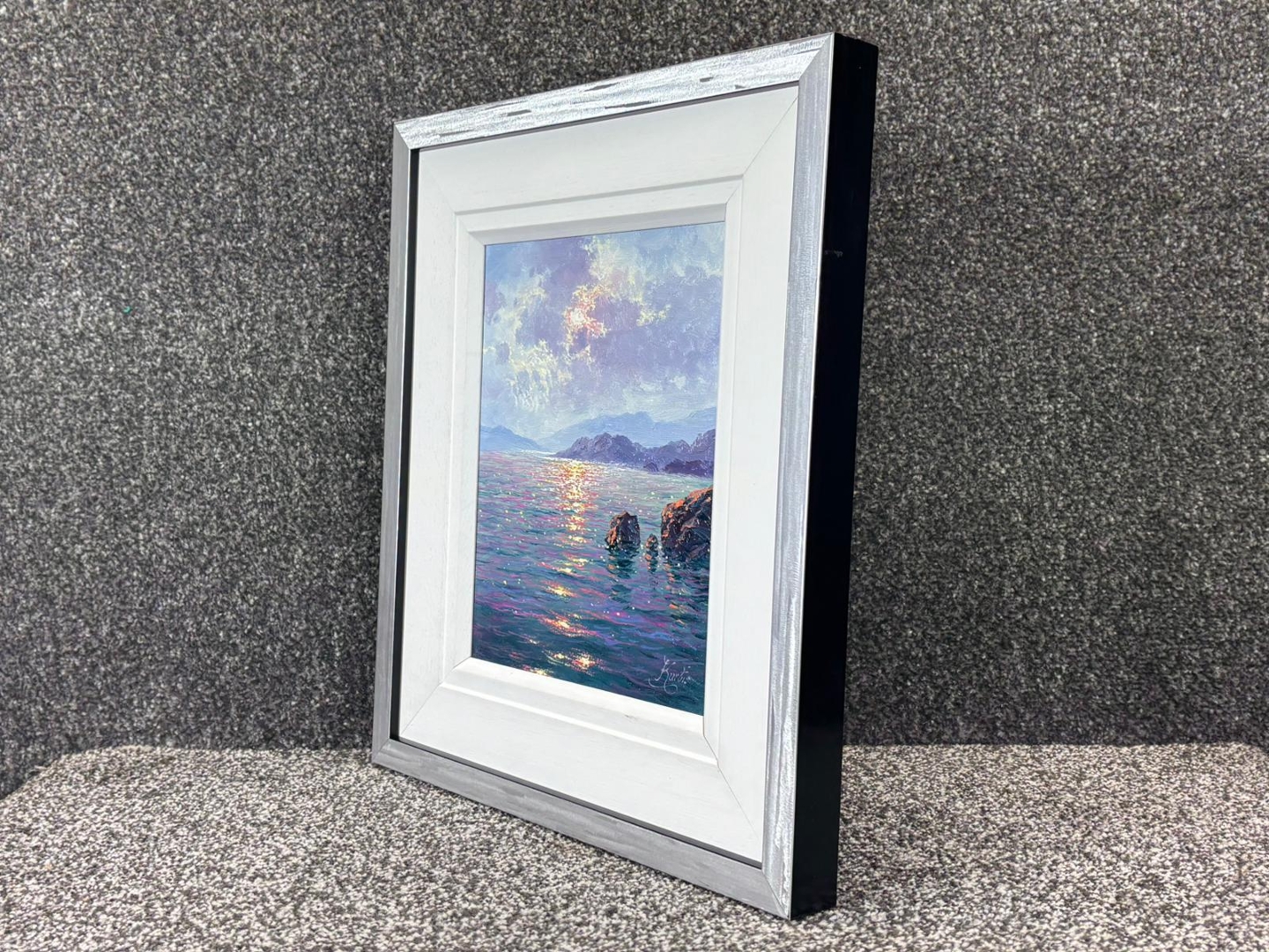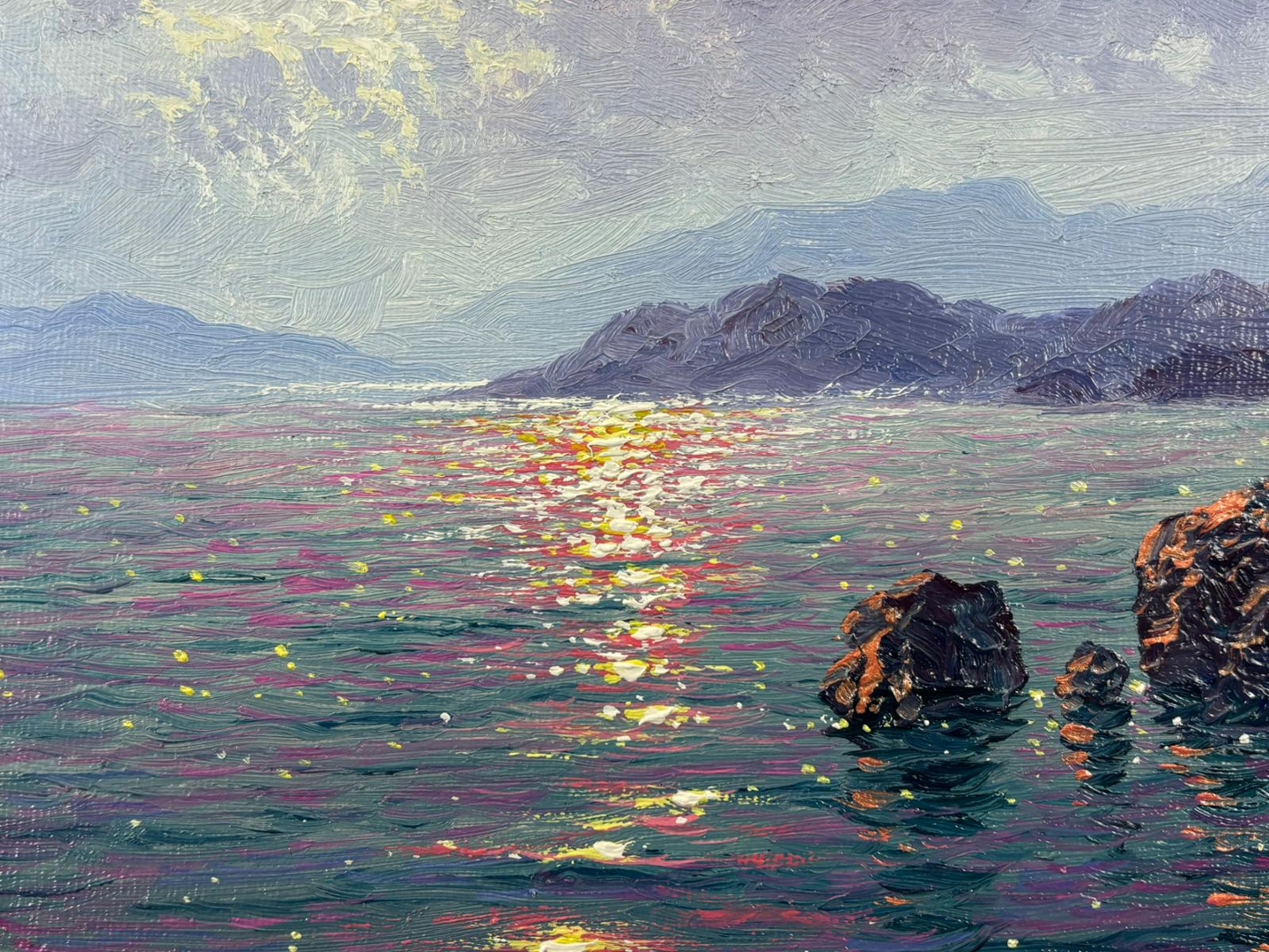 A rich interplay of colour and reflection defines the composition, with shimmering highlights stretching across the water’s surface in tones of gold, pink, and blue. The distant hills and softly textured sky create depth and balance, while the foreground rocks add structure and contrast. His expressive yet controlled brushwork brings a sense of movement and luminosity to the scene.