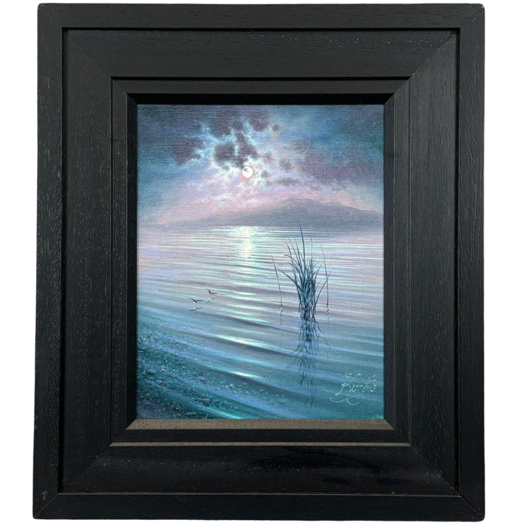 A serene framed original oil painting by Andrew Grant Kurtis titled ‘Moonlight Reflections Lakeland’, depicting a tranquil lakeside scene illuminated by a softly glowing moon. A London-born artist trained at the City and Guilds of London Institute, Kurtis is known for his refined use of atmospheric perspective and delicate handling of light, both of which are beautifully expressed in this शांत and contemplative composition.