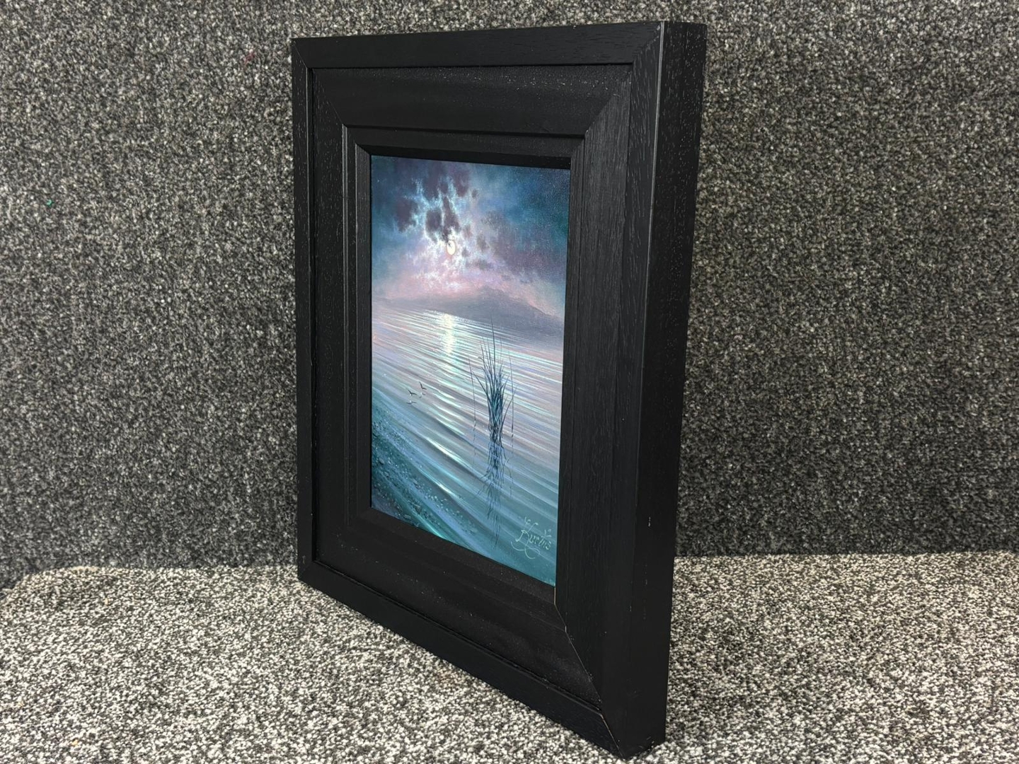 A framed original oil painting by Andrew Grant Kurtis titled 'Moonlight Reflections Lakeland'. Approx 10" height, 8" width.