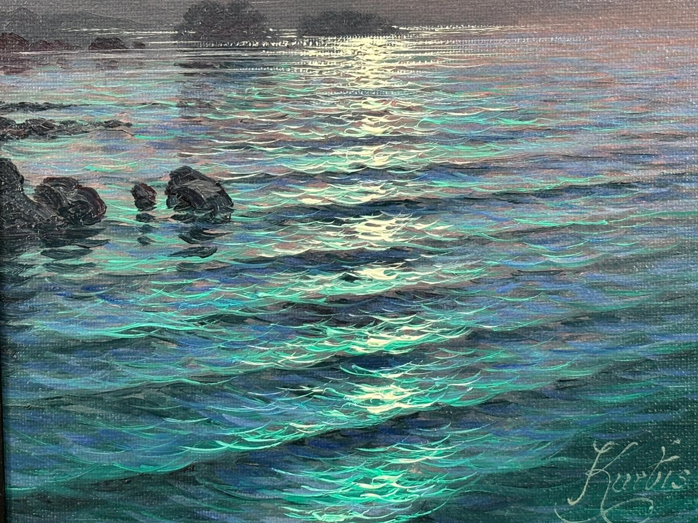 A well-proportioned artwork measuring approximately 10 inches in height and 8 inches in width, presented in a bold, dark frame that enhances the painting’s contrast and depth. A highly decorative and collectible piece, ideal for admirers of atmospheric landscapes and Kurtis’ distinctive style.