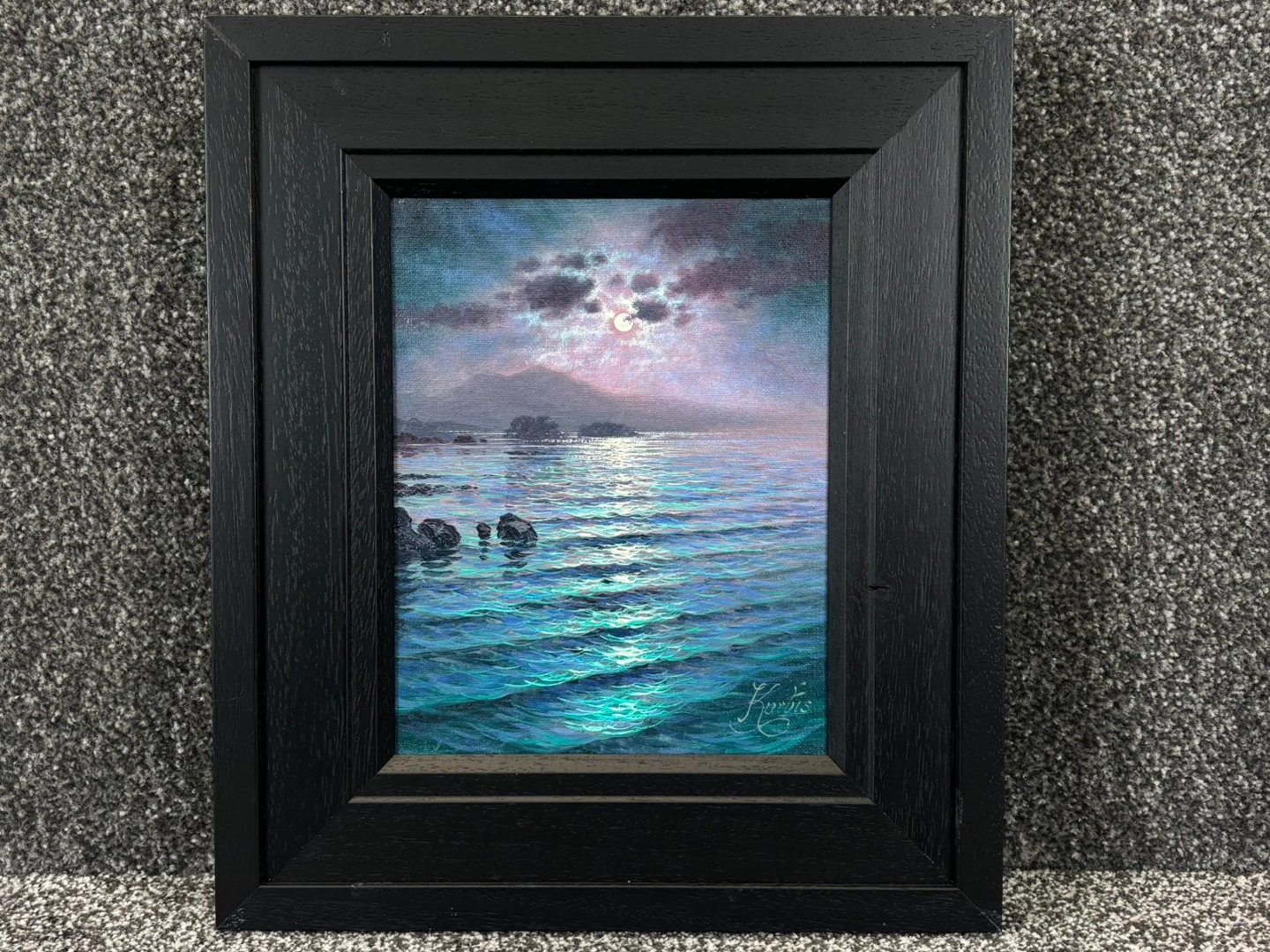 A framed original oil painting by Andrew Grant Kurtis titled 'Moonlight Sparkle Lakeland'. Approx 10" height, 8" width.