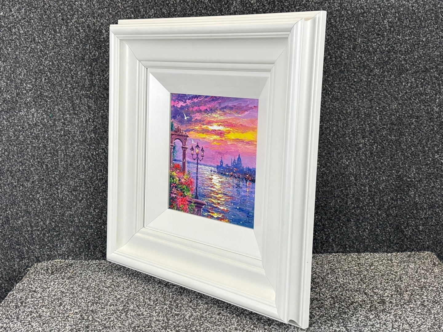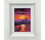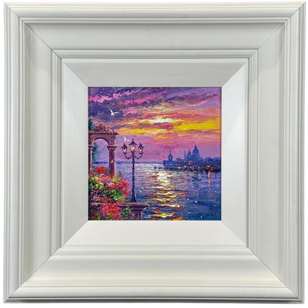 A vibrant framed original oil painting by Andrew Grant Kurtis titled ‘Reflections of Santa Maria Della Salute’, capturing the beauty of Venice at sunset with the iconic basilica set against a richly coloured sky. A London-born artist trained at the City and Guilds of London Institute, Kurtis is renowned for his mastery of atmospheric perspective and his expressive interpretation of light.