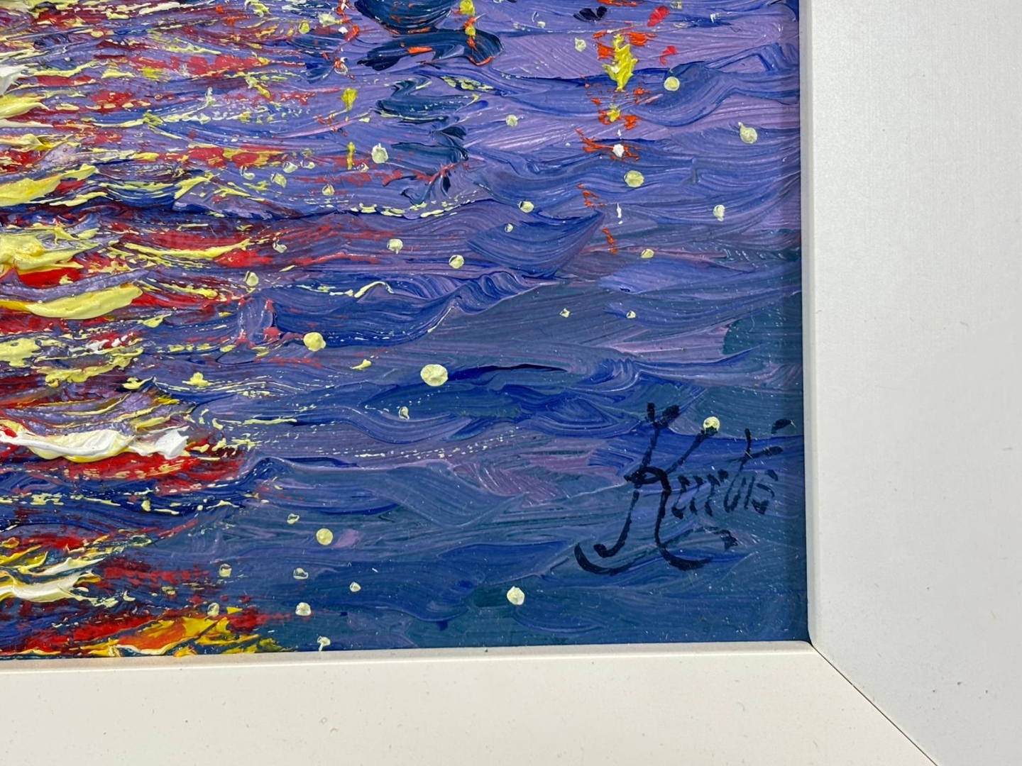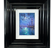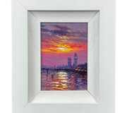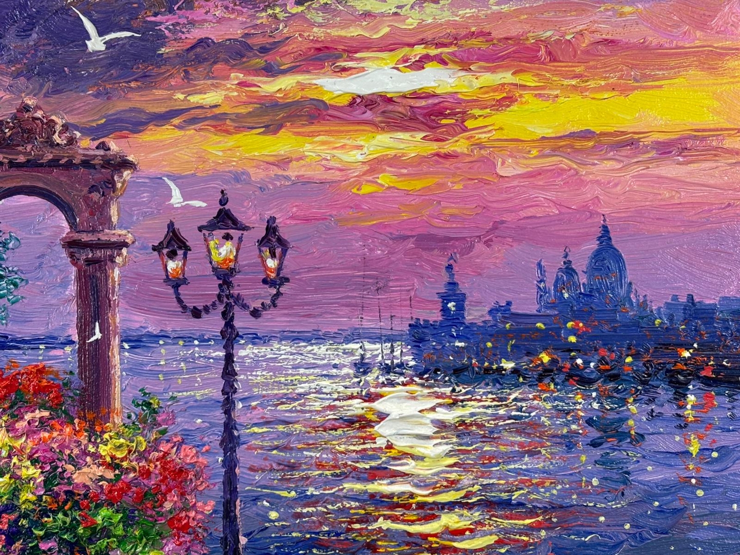 A striking composition, the painting is alive with bold impasto brushwork and a vivid palette of pinks, purples, and golden hues. The shimmering reflections ripple across the water, drawing the eye toward the distant skyline, while foreground architectural details and floral elements add depth and visual interest. The interplay of colour and texture creates a dynamic yet harmonious scene full of warmth and movement.
