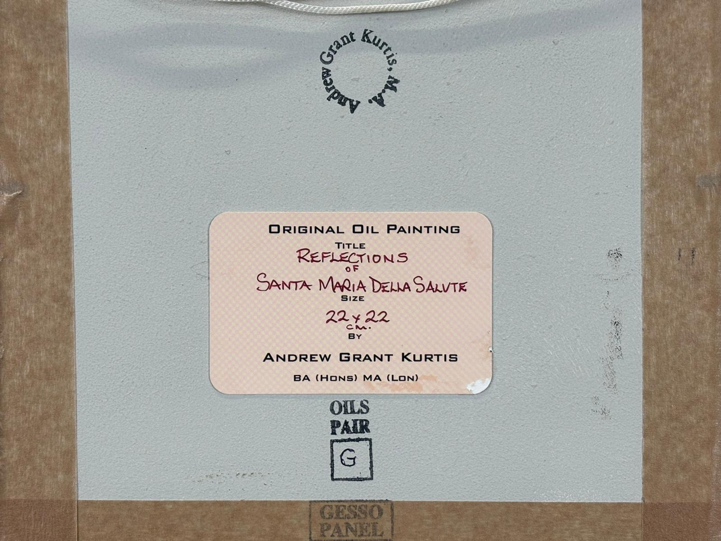 A framed original oil painting by Andrew Grant Kurtis titled 'Reflections of Santa Maria Della Salute'. Approx 9" height, 9" width.
