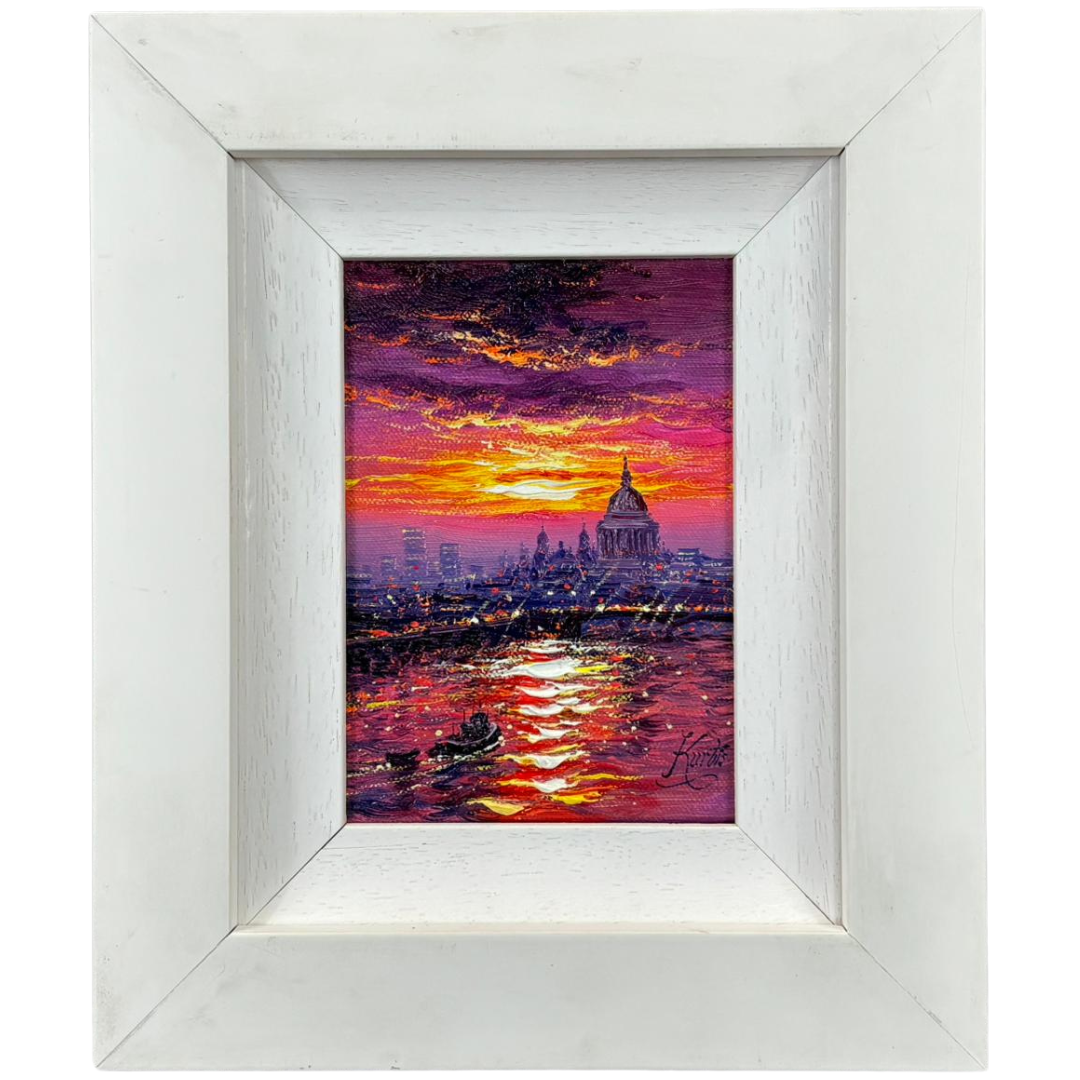 A compact yet striking artwork measuring approximately 7 inches in height and 5 inches in width, presented in a clean, contemporary frame that complements its vivid palette. A highly decorative and collectible piece, ideal for admirers of London scenes and Kurtis’ distinctive, light-driven style.