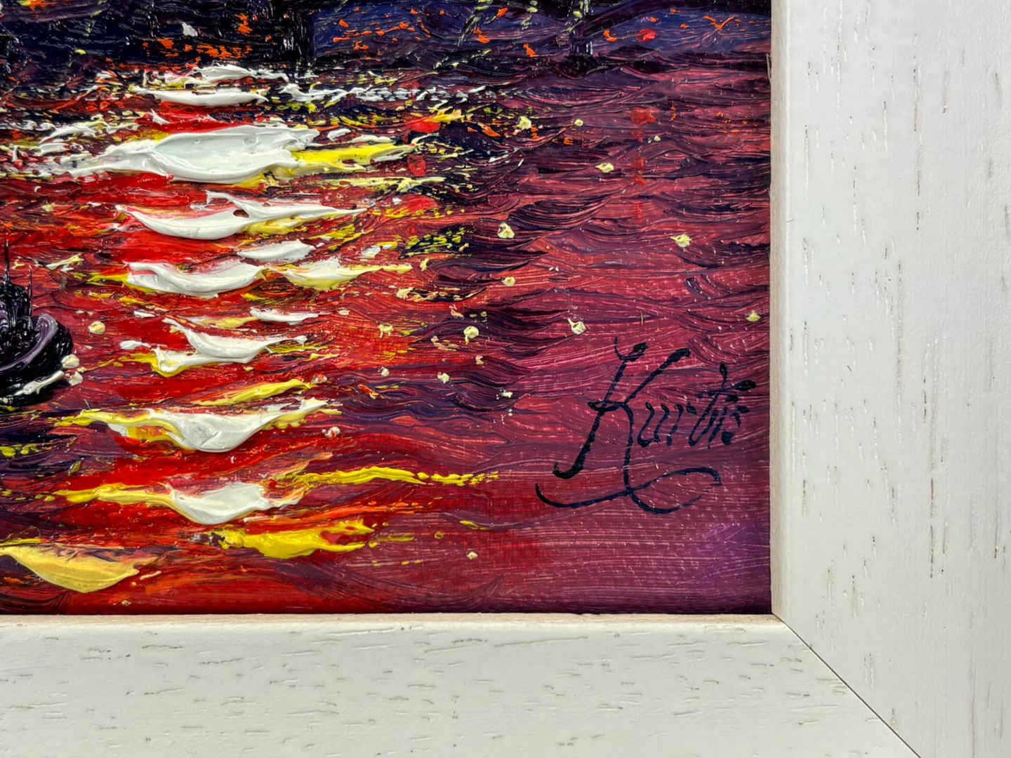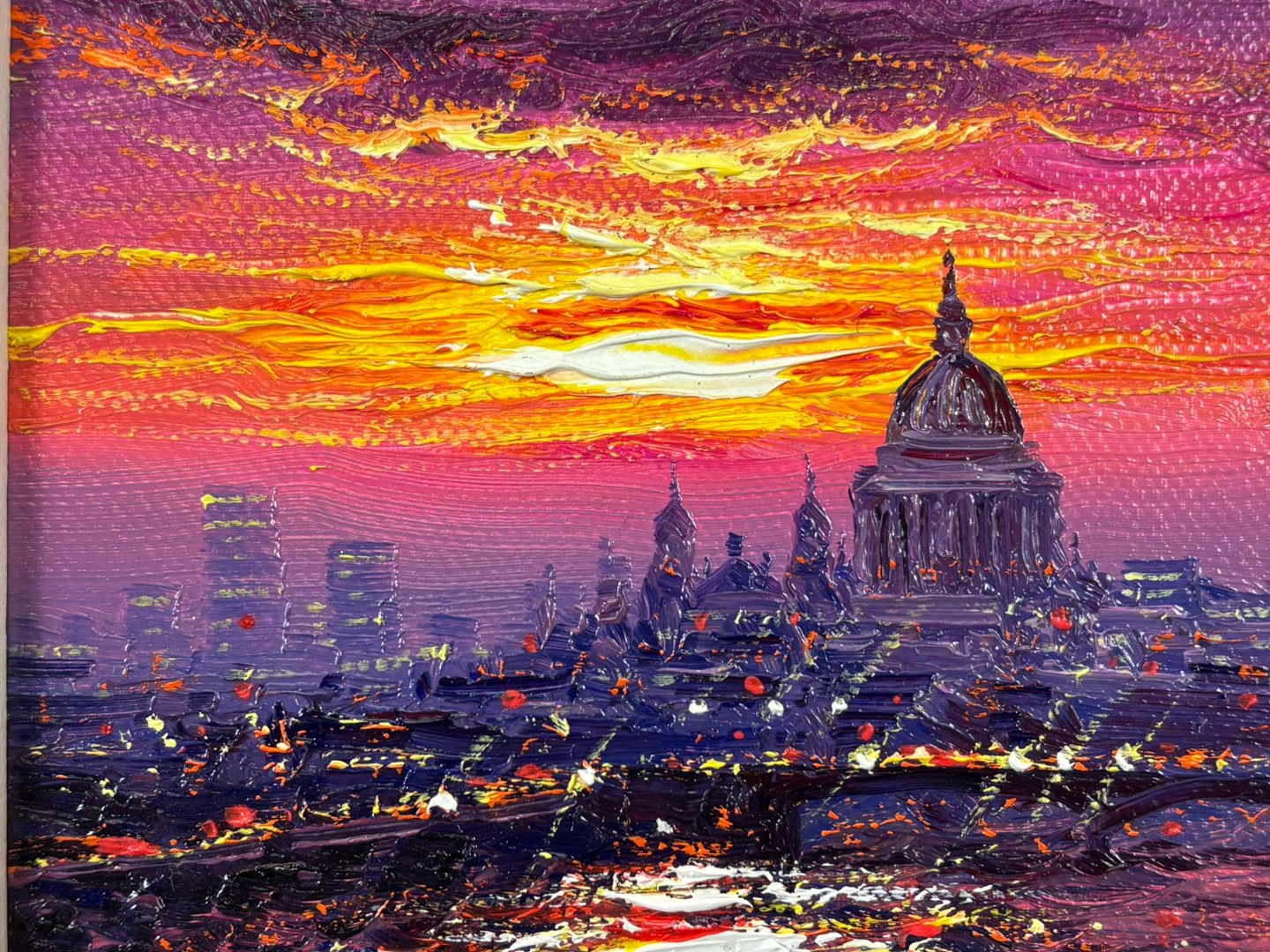A bold and energetic composition, the painting is defined by intense hues of crimson, orange, and violet sweeping across the sky and reflecting vividly onto the Thames below. The silhouette of St Paul’s Cathedral rises prominently on the horizon, while shimmering reflections ripple through the water in thick, textured brushstrokes. The inclusion of a small boat in the foreground adds scale and movement, enhancing the scene’s depth and visual impact.