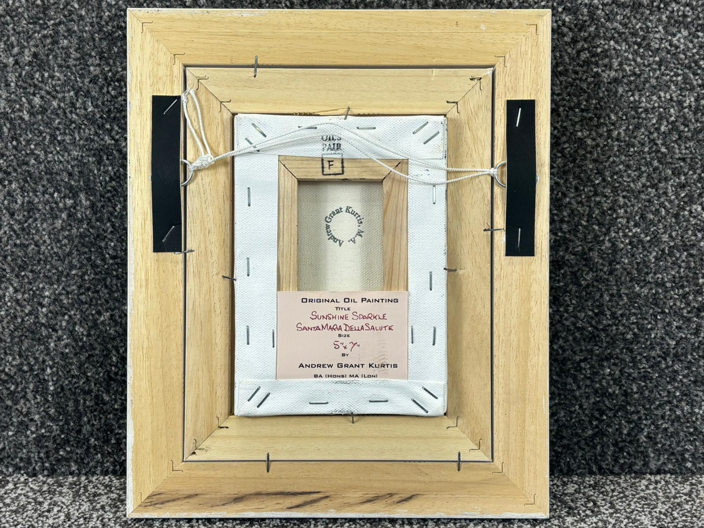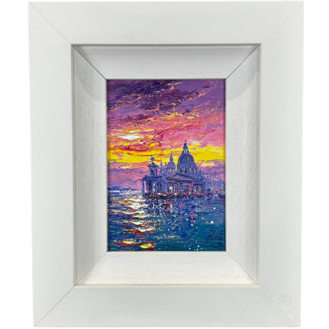 A framed original oil painting by Andrew Grant Kurtis titled 'Sunshine Sparkle Santa Maria Della Salute'. Approx 7" height, 5" width.