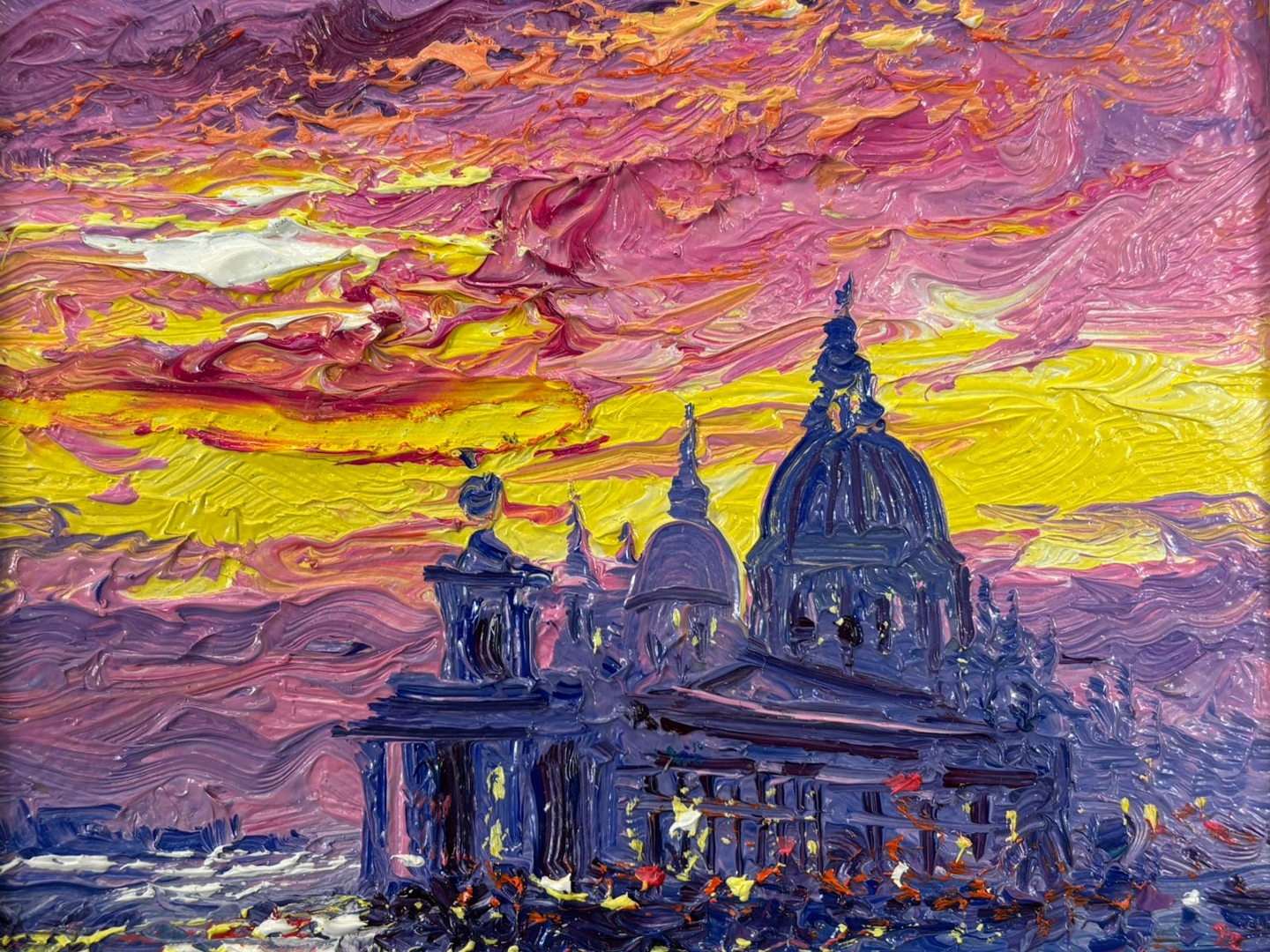 A richly textured composition, the painting features bold impasto brushwork and a vivid palette of purples, pinks, and golden yellows, contrasted against deep blue waters. The reflections shimmer with energy, drawing the eye across the surface, while the architectural silhouette of Santa Maria della Salute anchors the scene with elegance and balance. The dynamic interplay of colour and light creates a captivating sense of warmth and movement.