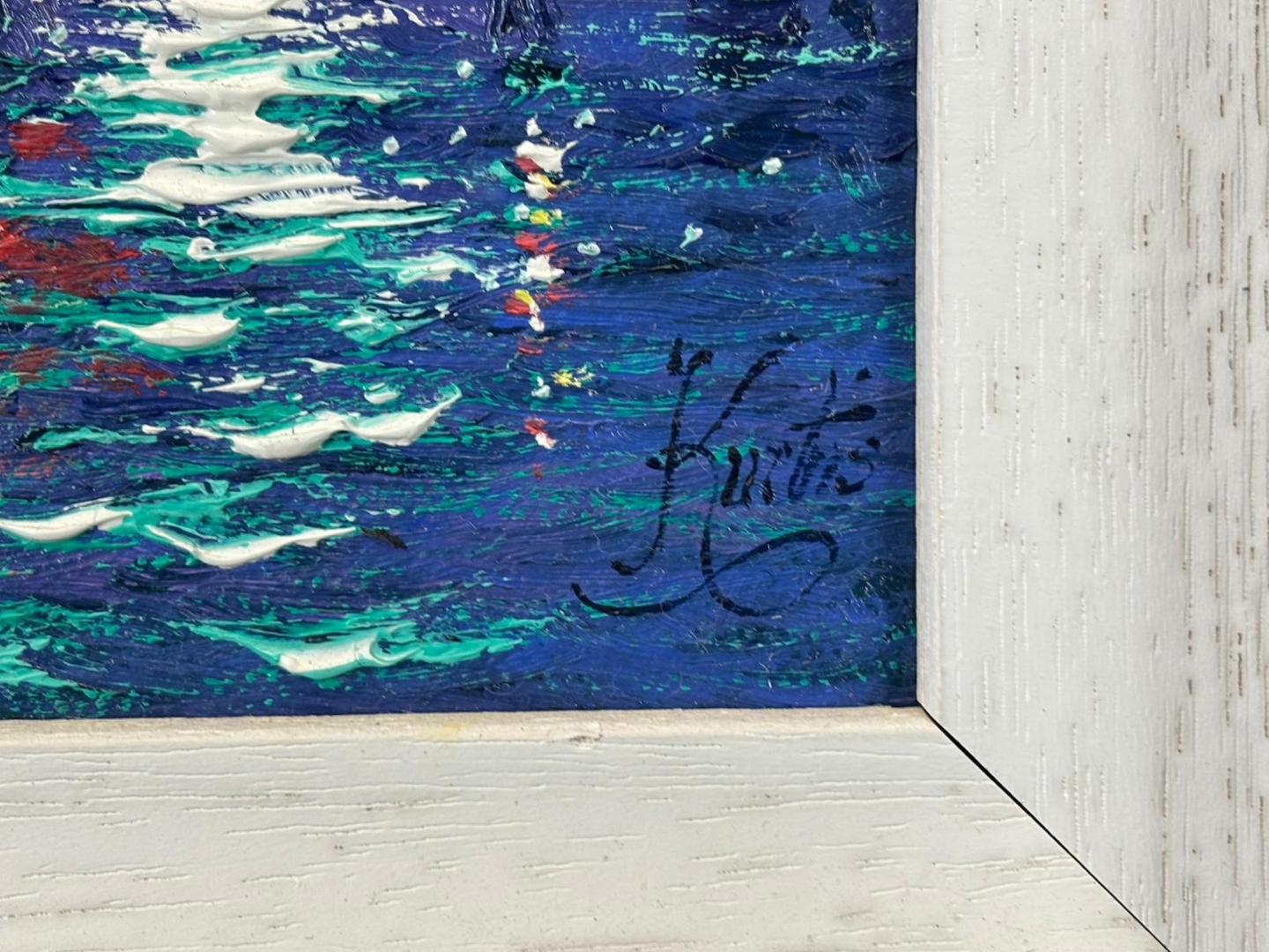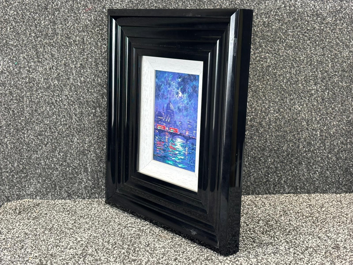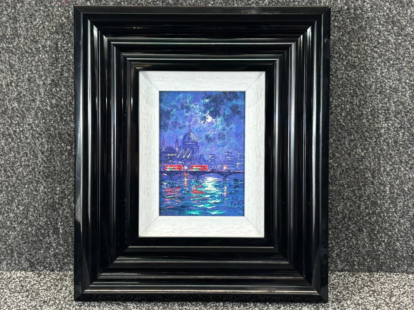 A compact and highly decorative artwork measuring approximately 7 inches in height and 5 inches in width, presented in a bold, substantial frame that enhances its visual presence. A collectible piece, ideal for admirers of London scenes and Kurtis’ distinctive nocturnal style.
