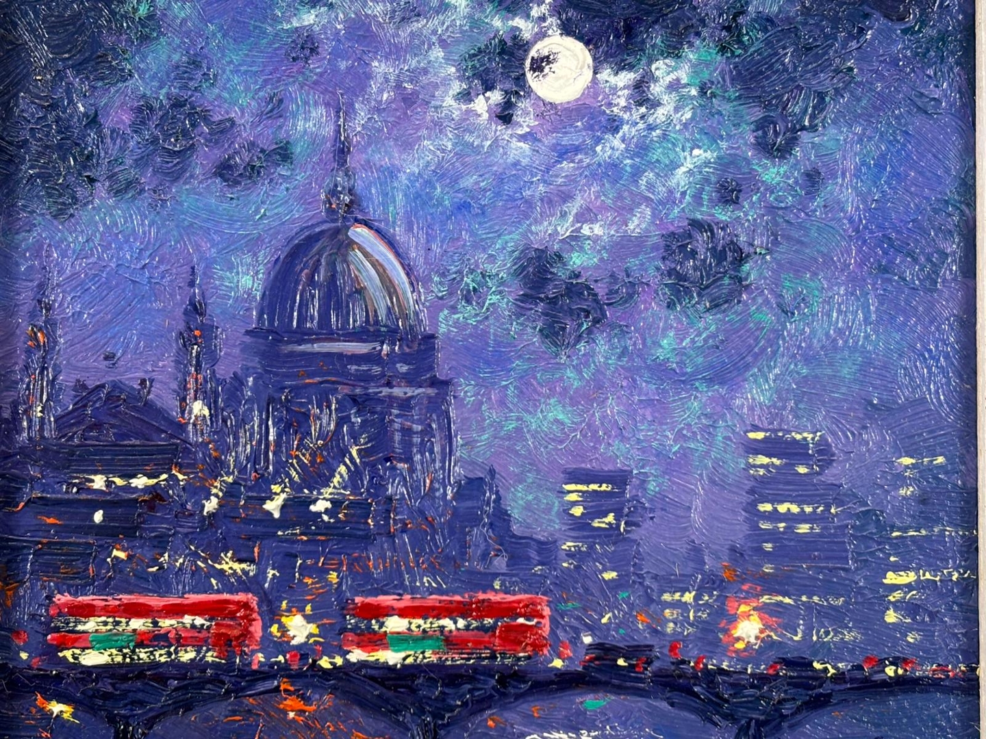 A rich and expressive composition, the painting features deep blues and cool tones illuminated by vibrant highlights reflecting across the Thames. The glow of city lights and passing traffic introduces flashes of red and gold, adding movement and contrast, while the moonlight creates a soft, shimmering pathway across the water. His textured brushwork enhances both depth and atmosphere.