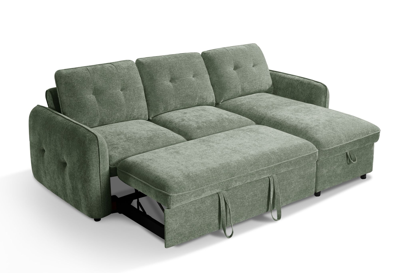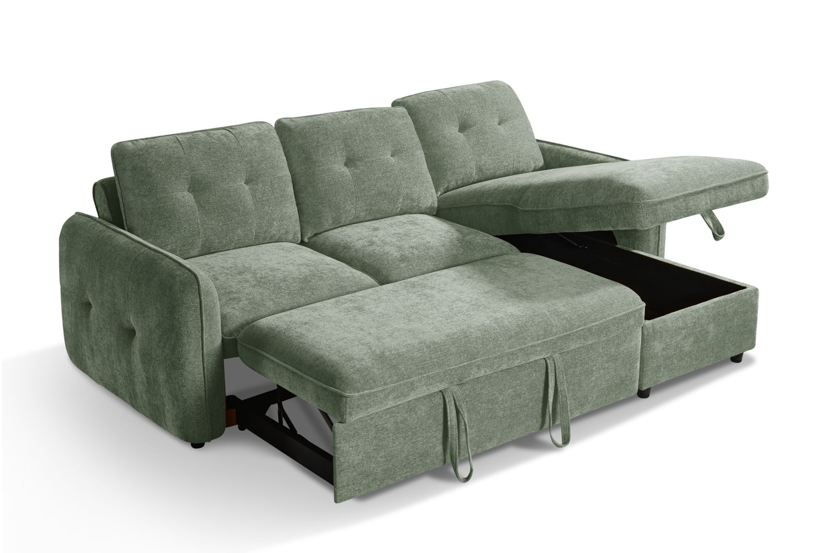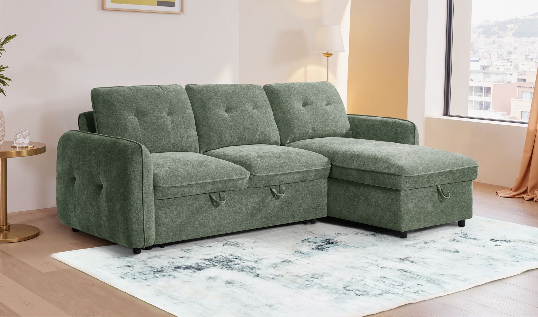 An olive Venice Sofa Bed on black legs, featuring a lift-up storage compartment.