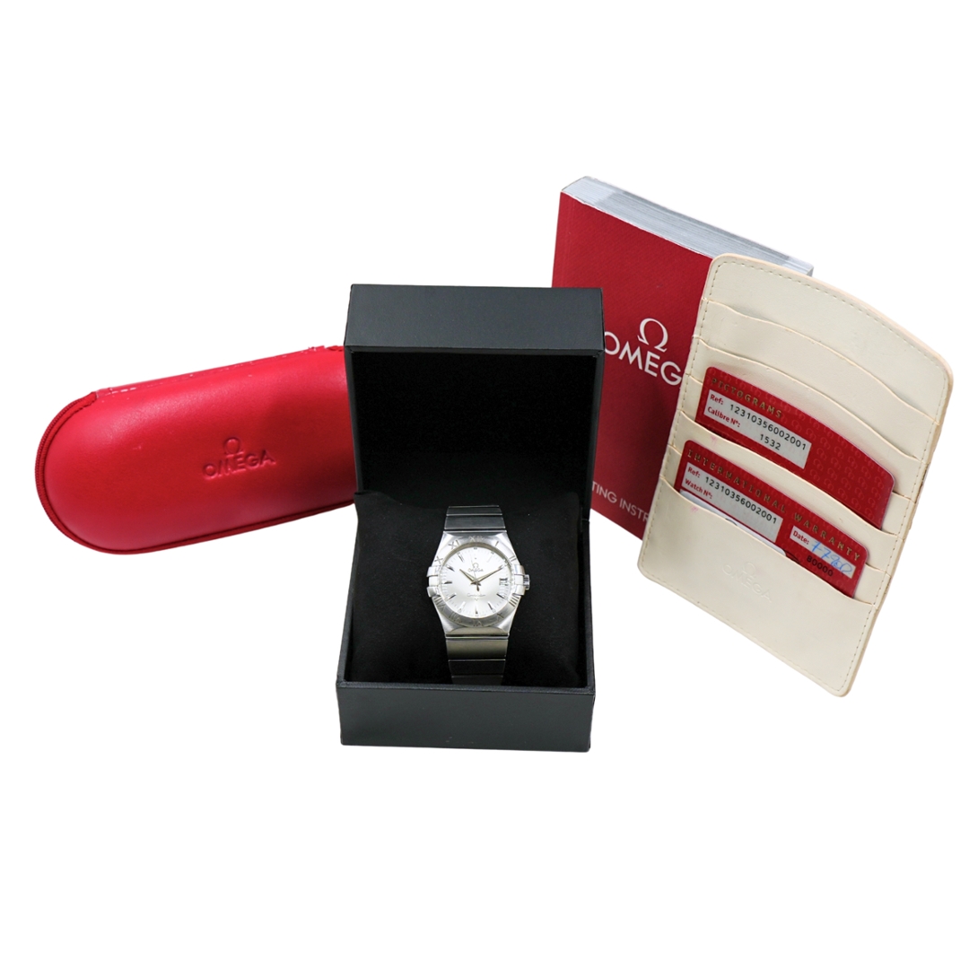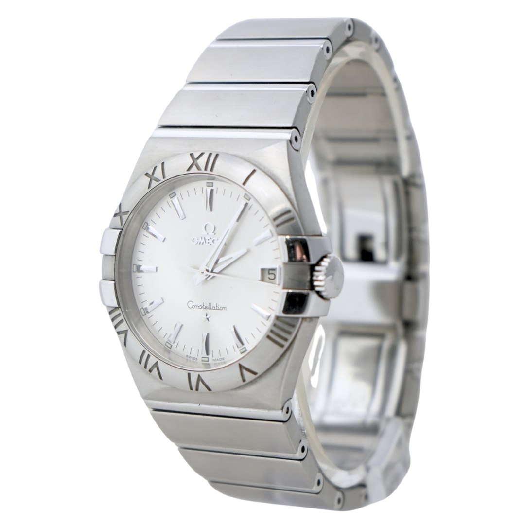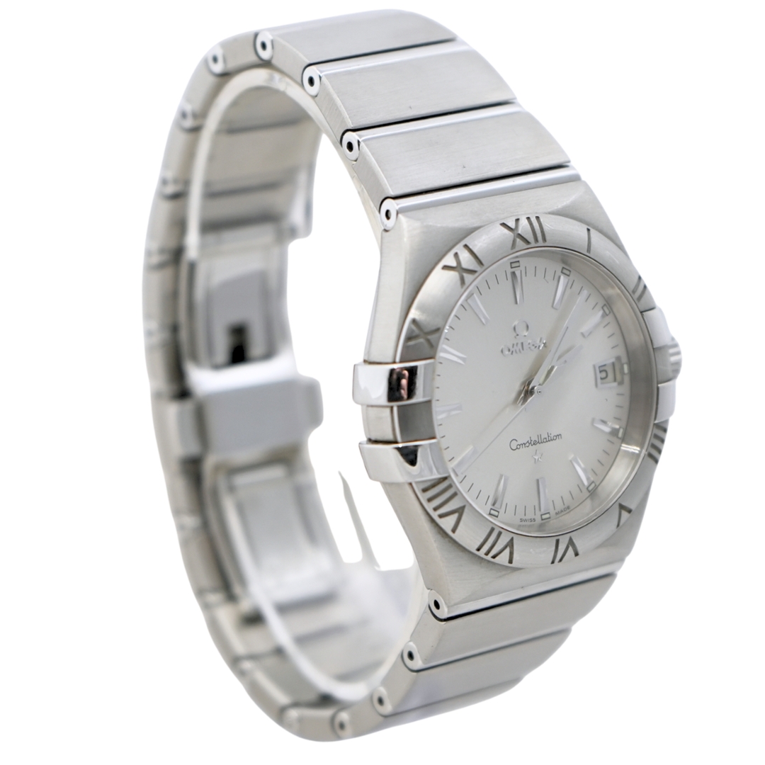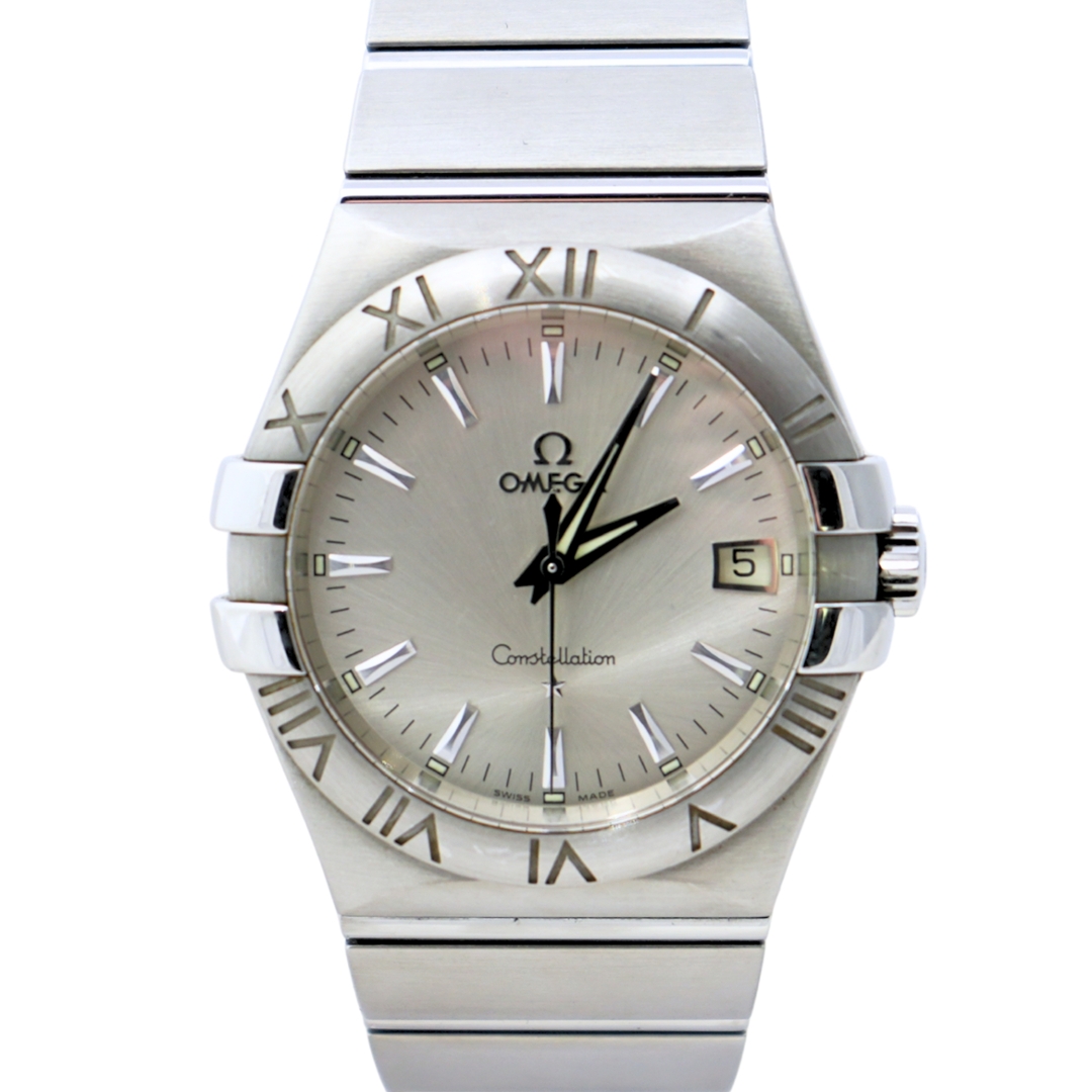 An Omega Constellation Date watch crafted in stainless steel, featuring a refined silver dial that embodies timeless elegance and precision. Model number 12310356002001, this 2012 example houses a highly reliable Omega quartz movement, offering superb accuracy and effortless everyday practicality. The 35mm case presents the signature Constellation design, distinguished by its integrated bracelet, polished bezel with engraved Roman numerals, and signature “claws” at 3 and 9 o’clock—hallmarks of Omega’s iconic style.