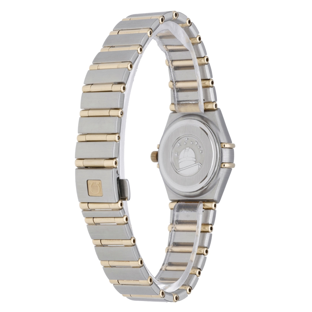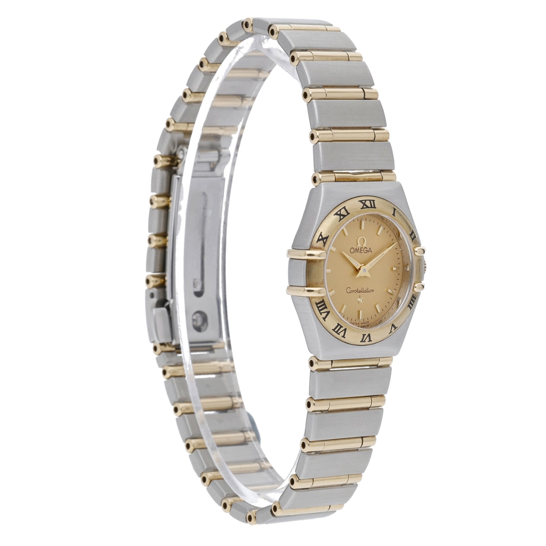 This Omega Constellation reference 1262.10.00 presents a compact 22mm case in stainless steel, complemented by a yellow gold Roman numeral bezel and integrated bi-metal bracelet. The champagne dial features applied baton hour markers and matching gold hands, framed by a sapphire crystal. The distinctive Constellation claws and slim profile reflect the refined design language associated with this long-running collection.