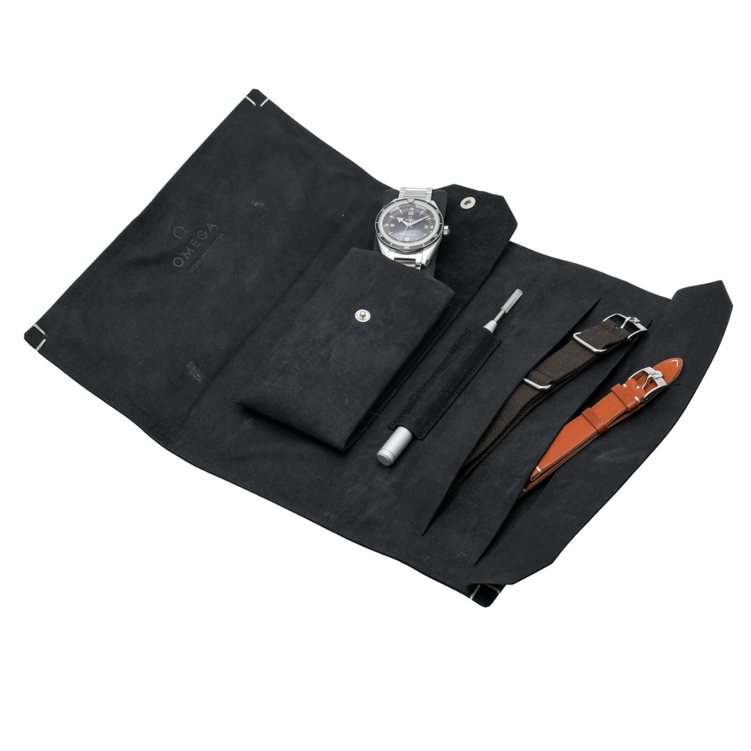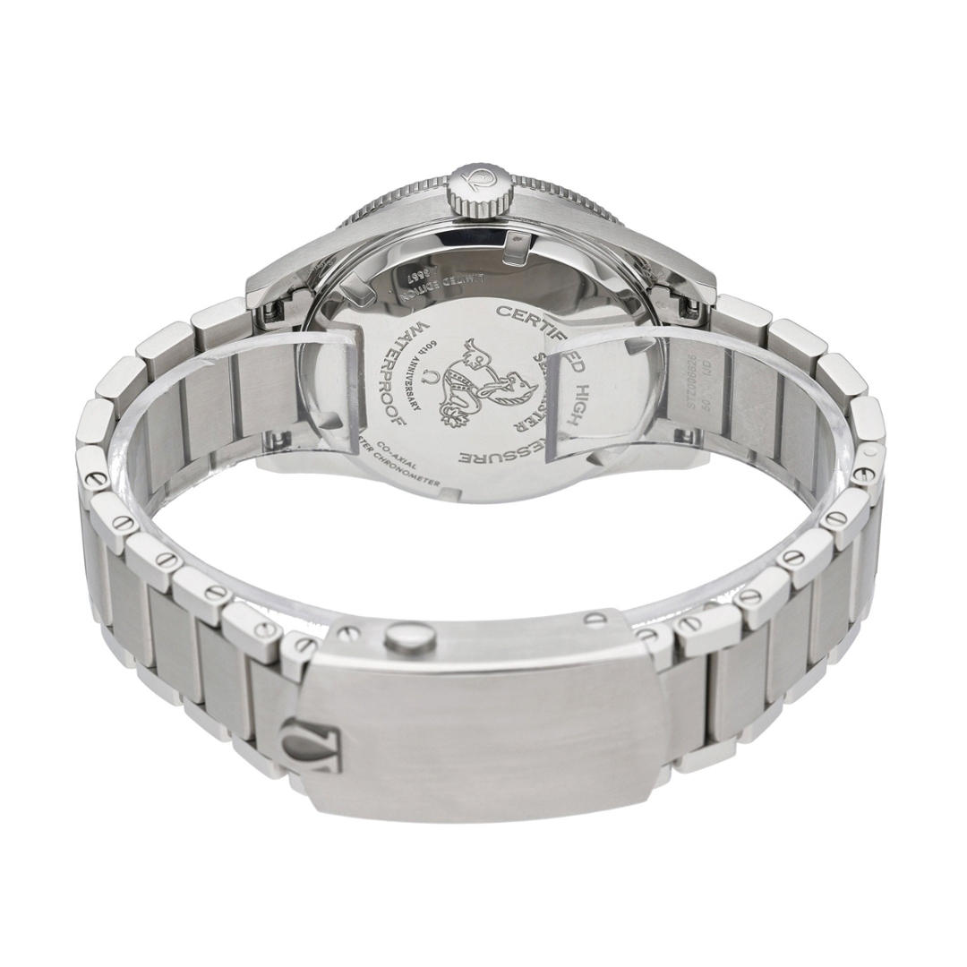 At its heart lies the Omega Co-Axial Master Chronometer Calibre 8806, an automatic movement officially certified by METAS. Resistant to magnetic fields up to 15,000 gauss, it offers modern precision and durability while delivering a 55-hour power reserve. Its screw-down crown and robust construction ensure water resistance to 300 metres, reinforcing the watch’s professional dive credentials.