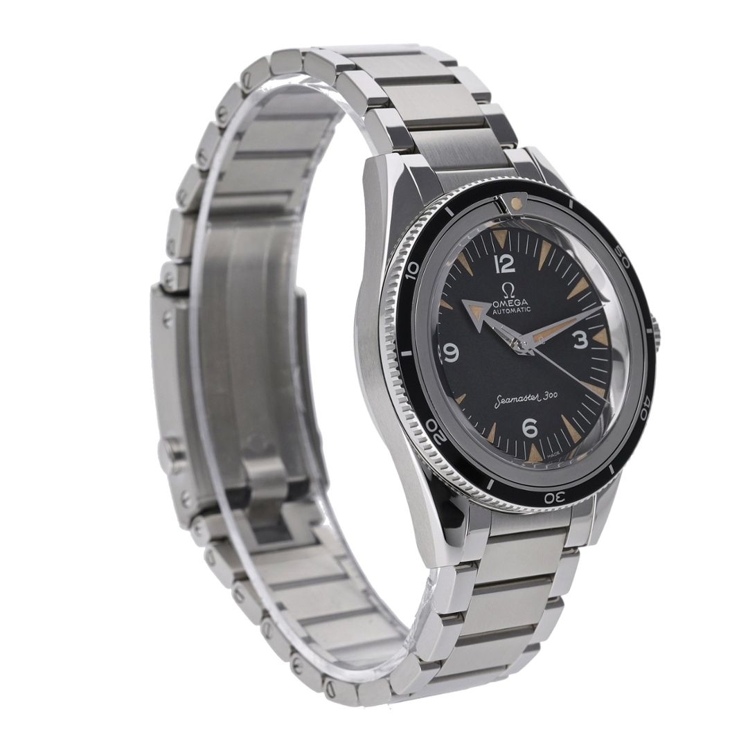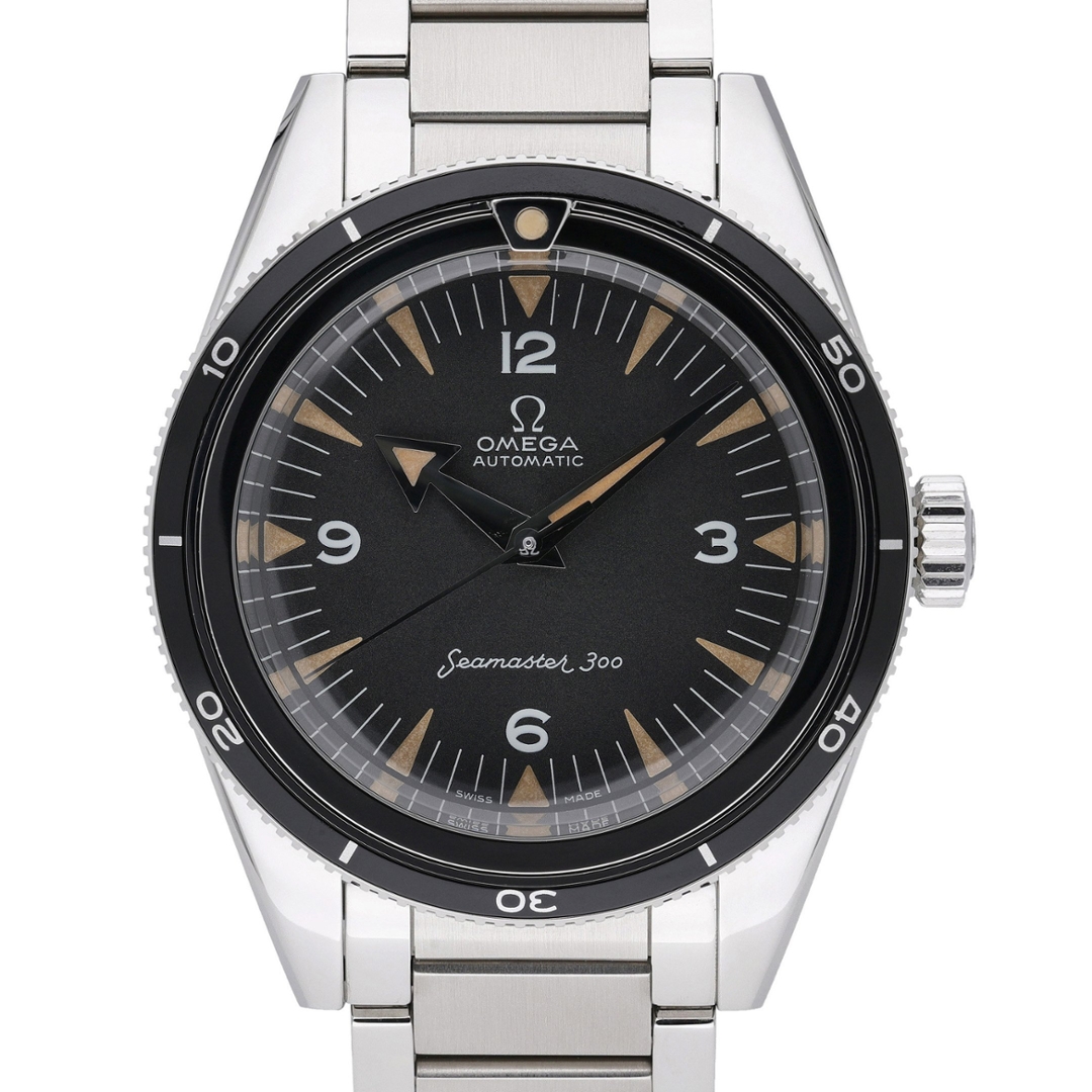 An Omega Seamaster 300, reference 234.10.39.20.01.001, revives one of Omega’s most iconic dive watches with a faithful vintage-inspired design. The 39mm stainless steel case is complemented by a black aluminium bezel and a deep black dial with recessed triangular indices and Arabic numerals at 3, 6, 9, and 12. The beige-toned Super-LumiNova brings a warm, retro patina effect, echoing the aesthetics of the original 1957 Seamaster 300.