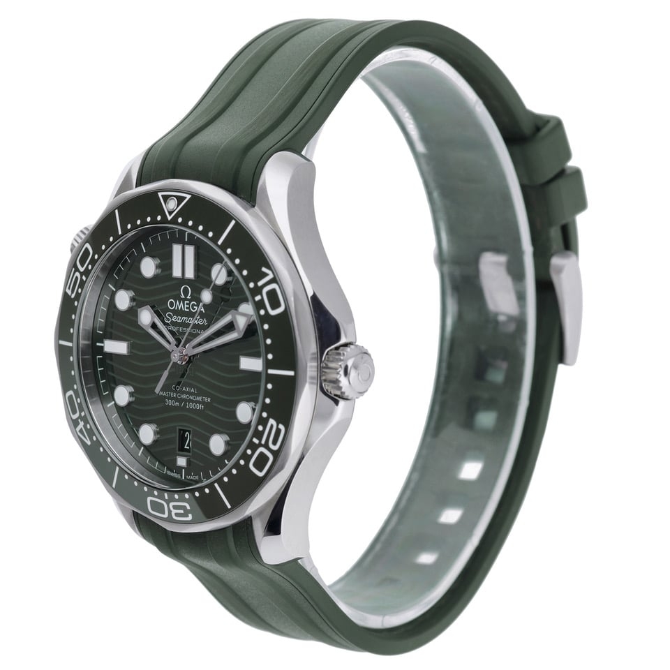 An Omega Seamaster Diver 300M, presented in a striking full-green configuration with matching green rubber strap, stainless steel case and clasp, and a green ceramic bezel and dial. Reference 21032422010001, this 2022 model captures everything collectors love about the modern Seamaster — bold colour, technical excellence and unmistakable Omega presence.