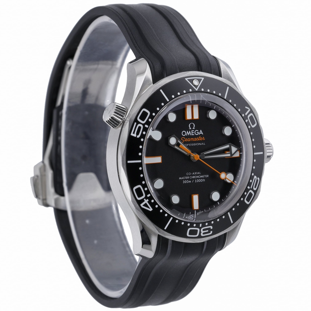 An Omega Seamaster Diver 300M, reference 210.32.42.20.01.006, presented on a black rubber strap with a stainless steel case and clasp. The 42mm case delivers strong wrist presence, paired with a black ceramic bezel featuring a white diving scale. The black dial is accented with bold luminous hour markers and distinctive orange detailing, while the skeletonised hands and unidirectional bezel reinforce its professional dive watch credentials.
