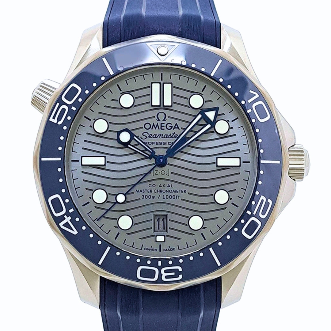 An Omega Seamaster Diver 300M, presented in stainless steel with a striking blue ceramic bezel and contrasting grey wave-pattern dial. The 42mm case delivers strong wrist presence, while the blue rubber strap enhances its sporty, contemporary appeal. The laser-engraved wave dial, paired with bold luminous markers and skeleton hands, reinforces the Seamaster’s iconic identity while offering excellent legibility in all conditions.