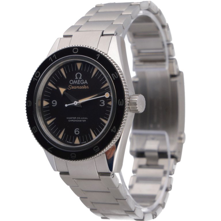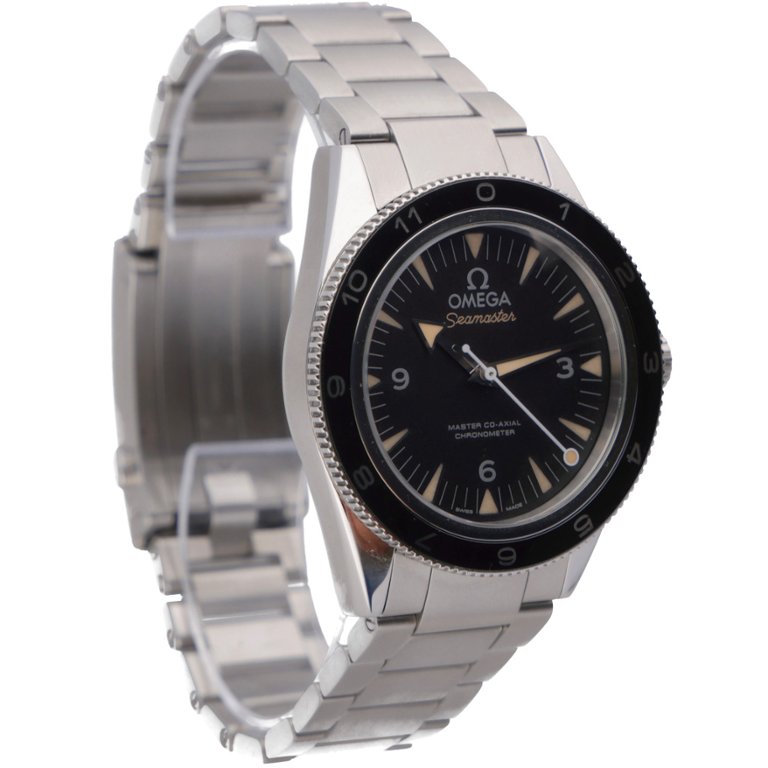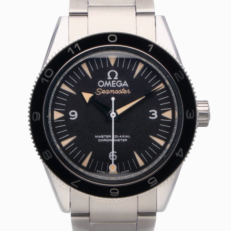 An Omega Seamaster Limited Edition reference 233.32.41.21.01.001, presented in stainless steel with a 41mm case and a striking black ceramic bezel paired with a matching black dial. Designed with strong vintage inspiration, this model features aged luminous hour markers, broad arrow hands, and a clean, symmetrical layout that pays tribute to Omega’s historic dive watches while maintaining a distinctly modern execution.