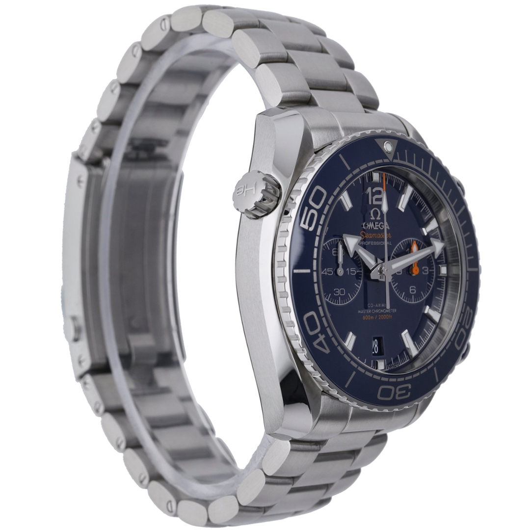 An Omega Seamaster Planet Ocean Chronograph watch crafted in stainless steel, featuring a striking blue ceramic bezel and matching blue dial that embody the spirit of Omega’s maritime legacy. Model number 215.30.46.51.03.001, this 2025 example is powered by the exceptional Omega Co-Axial Master Chronometer Calibre 9900 movement, officially certified by METAS for precision, magnetic resistance, and reliability. The 45.5mm case offers a commanding wrist presence while maintaining balanced proportions, making it both a professional diving instrument and a luxury sports chronograph.