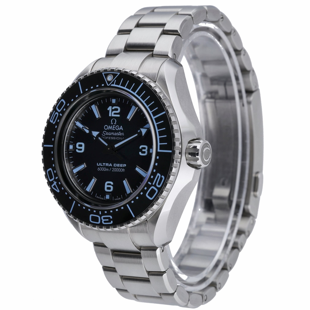 An Omega Seamaster Ultra Deep 6000M watch, model 215.30.46.21.03.002, crafted in stainless steel with a dark blue ceramic bezel and matching gradient blue dial. The substantial 45.5mm case is engineered for extreme performance, featuring a unidirectional diving bezel and bold luminous markers for maximum legibility in the harshest underwater conditions. The dial is marked “ULTRA DEEP 6000m / 20000ft”, reflecting its extraordinary depth rating and professional-grade capability.
