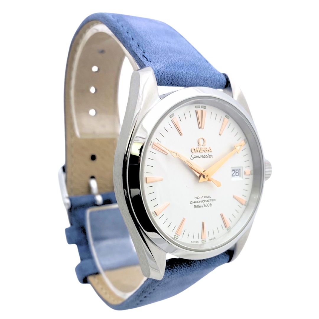An Omega Seamaster Watch, Blue Leather Strap with a Stainless Steel Case & Clasp on a White Dial