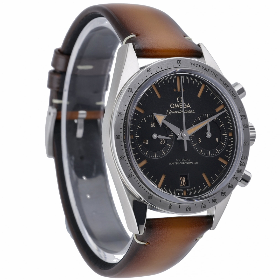 An Omega Speedmaster ’57 Chronograph, reference 332.12.41.51.01.001, presented with a black dial featuring warm vintage-toned hour markers and broad arrow hands, paired with a rich brown leather strap. The stainless steel 40.5mm case is complemented by a brushed tachymetre bezel, offering a refined and wearable take on the classic Speedmaster aesthetic with clear nods to its 1957 origins.
