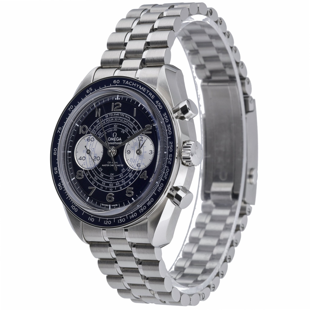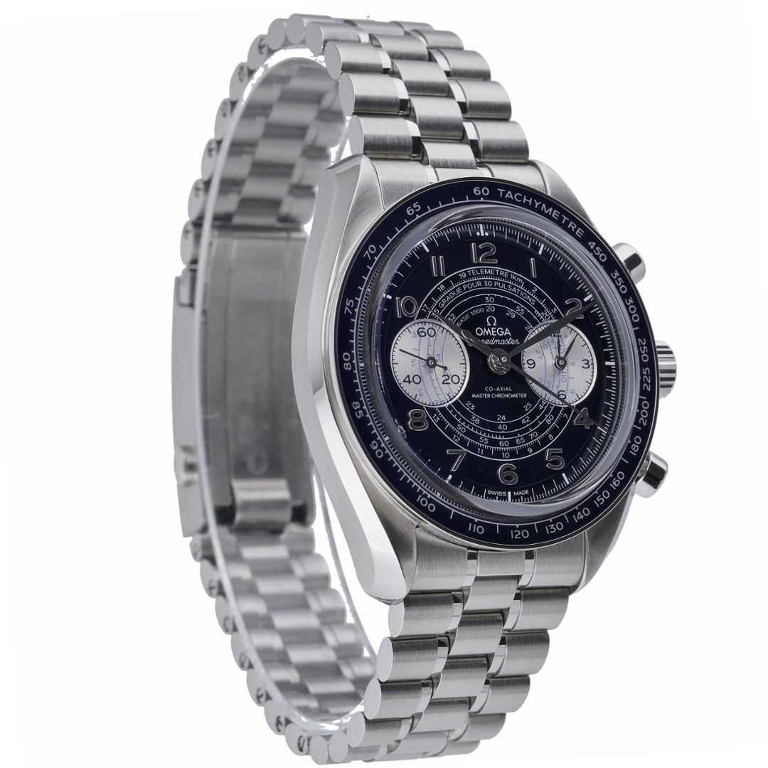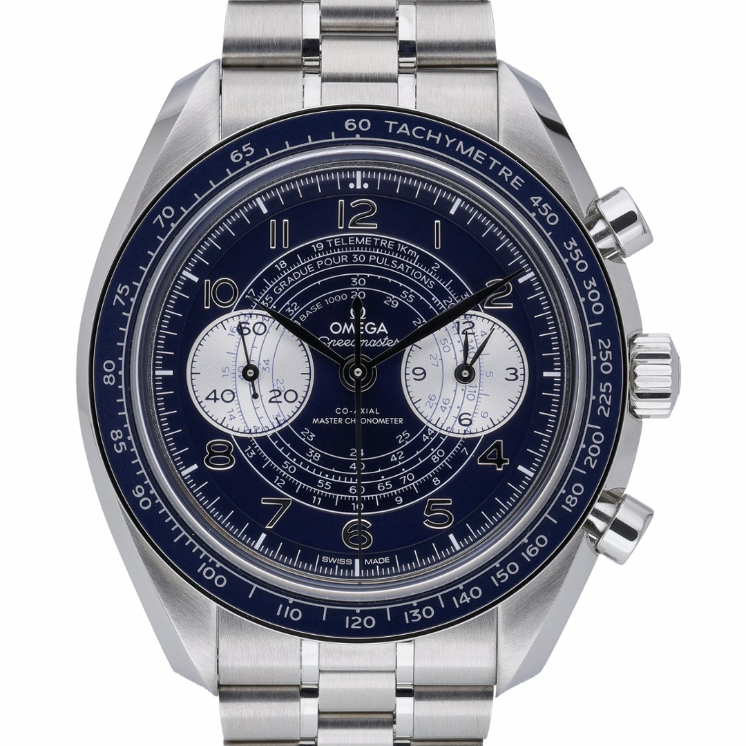 An Omega Speedmaster Chronoscope reference 329.30.43.51.03.001 is presented in stainless steel with a striking blue ceramic bezel and matching blue dial. The 43mm case is paired with a stainless steel bracelet, delivering substantial wrist presence while maintaining balanced proportions. The dial is richly detailed, featuring tachymeter, pulsometer and telemeter scales, twin silver sub-dials, applied Arabic numerals and luminous hands, combining vintage-inspired aesthetics with contemporary execution.