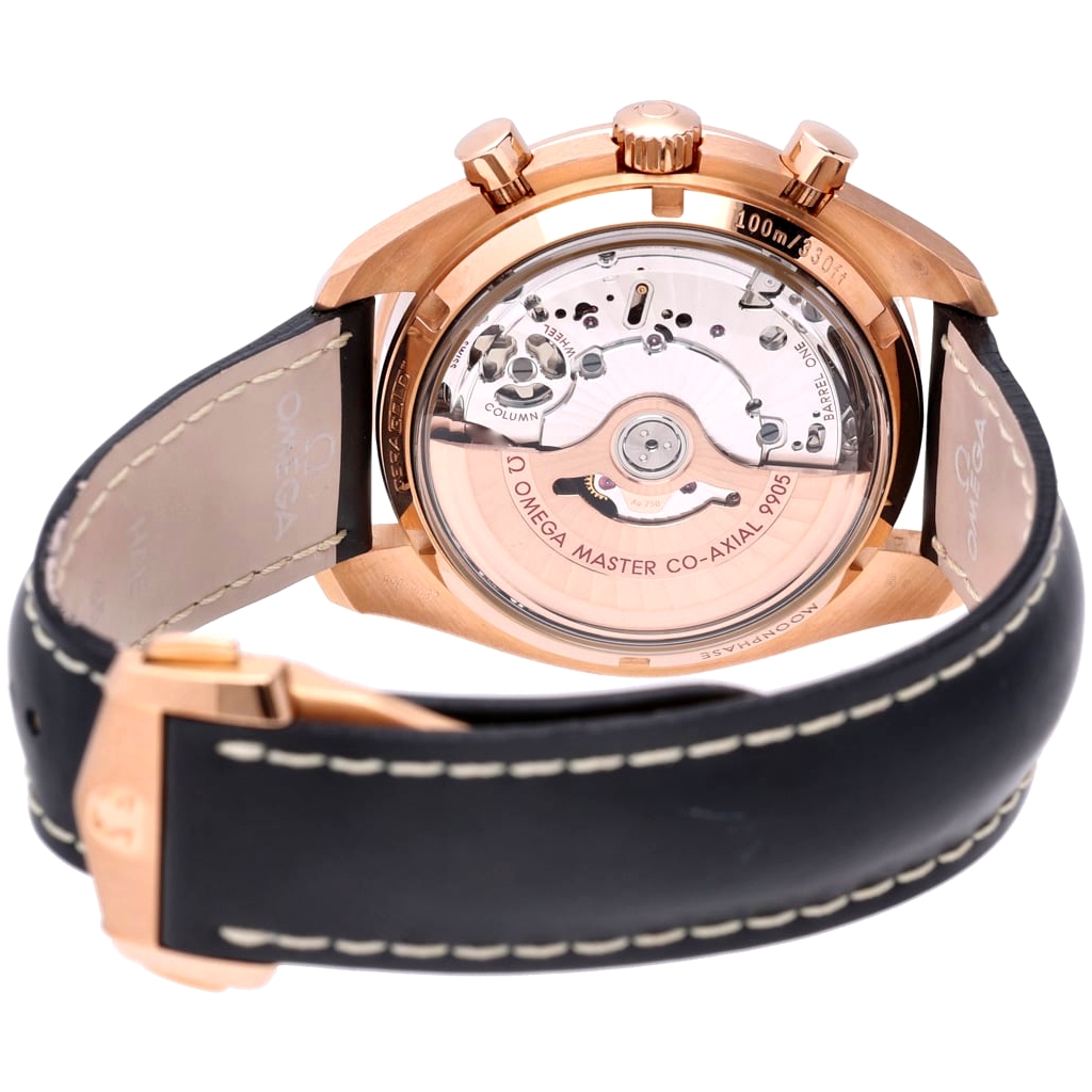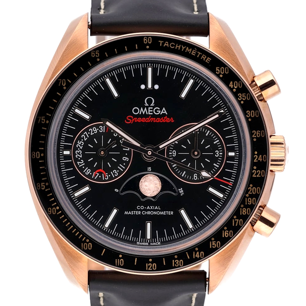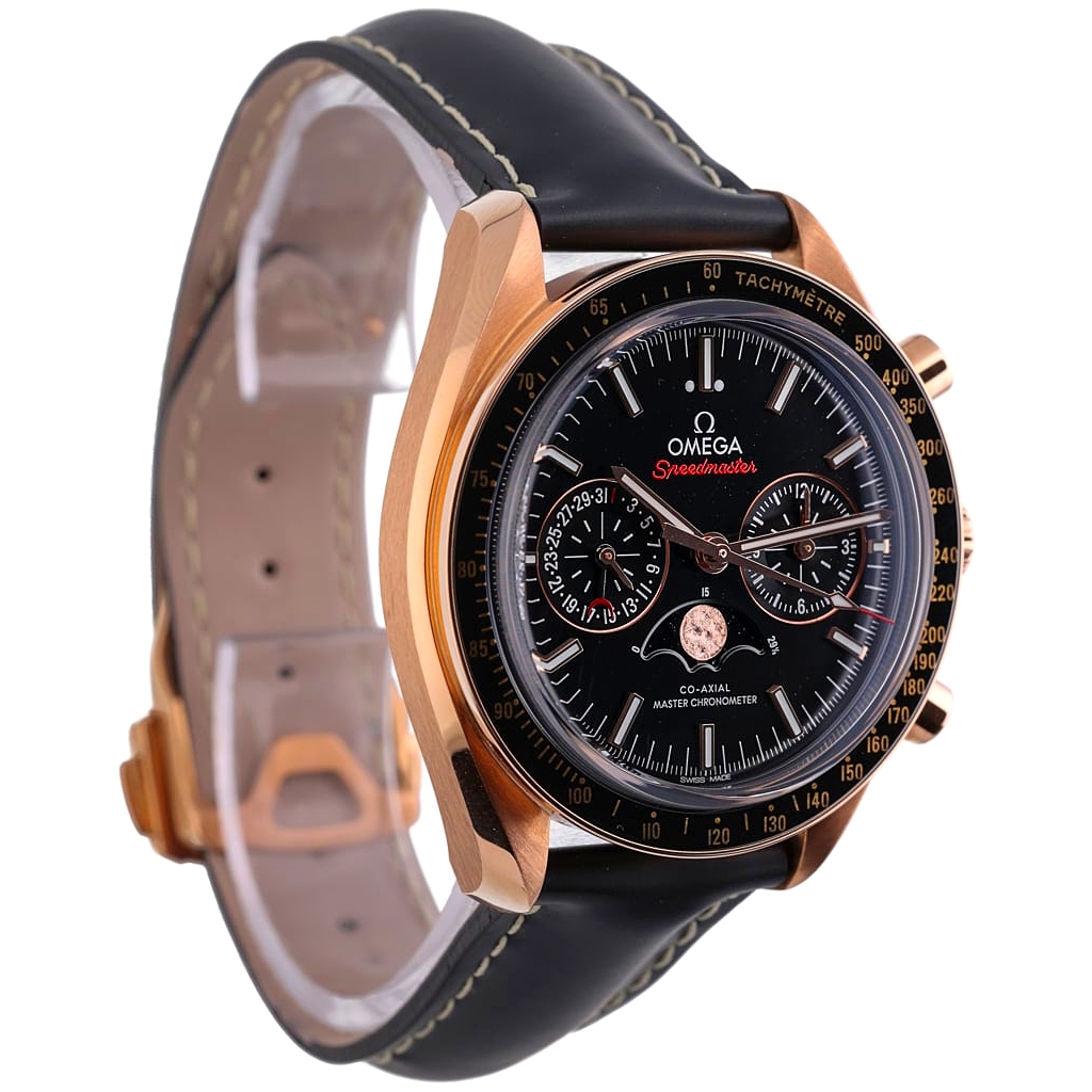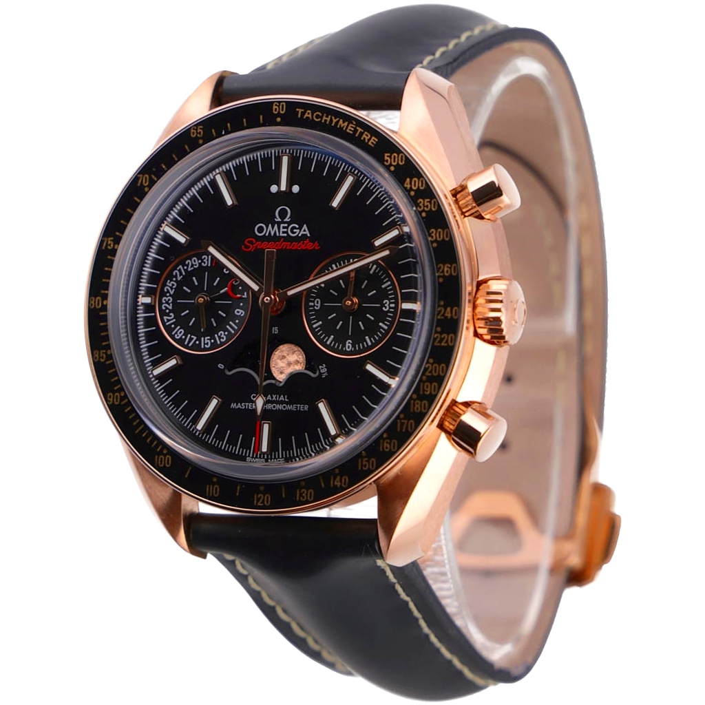 An Omega Speedmaster Moonphase Chronograph Watch, Black Leather Strap with an 18ct Rose Gold Case and Clasp and a Black Bezel & Dial.