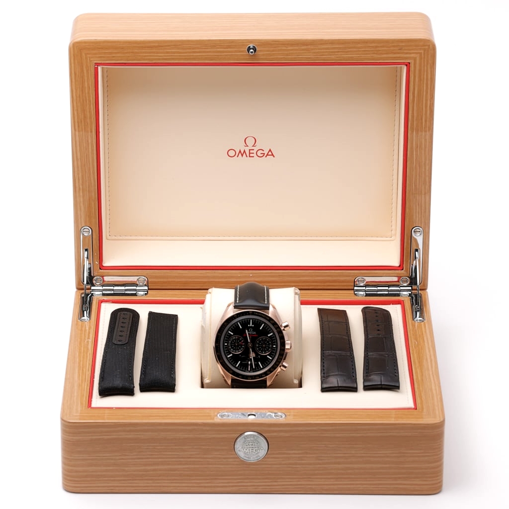 An Omega Speedmaster Moonphase Chronograph in 18ct rose gold, presented with original Omega paperwork, box, and additional straps. This is a deliberately elevated interpretation of the Speedmaster. The 44mm case provides a larger platform for Omega’s advanced complications, offering greater presence than traditional Speedmaster models.