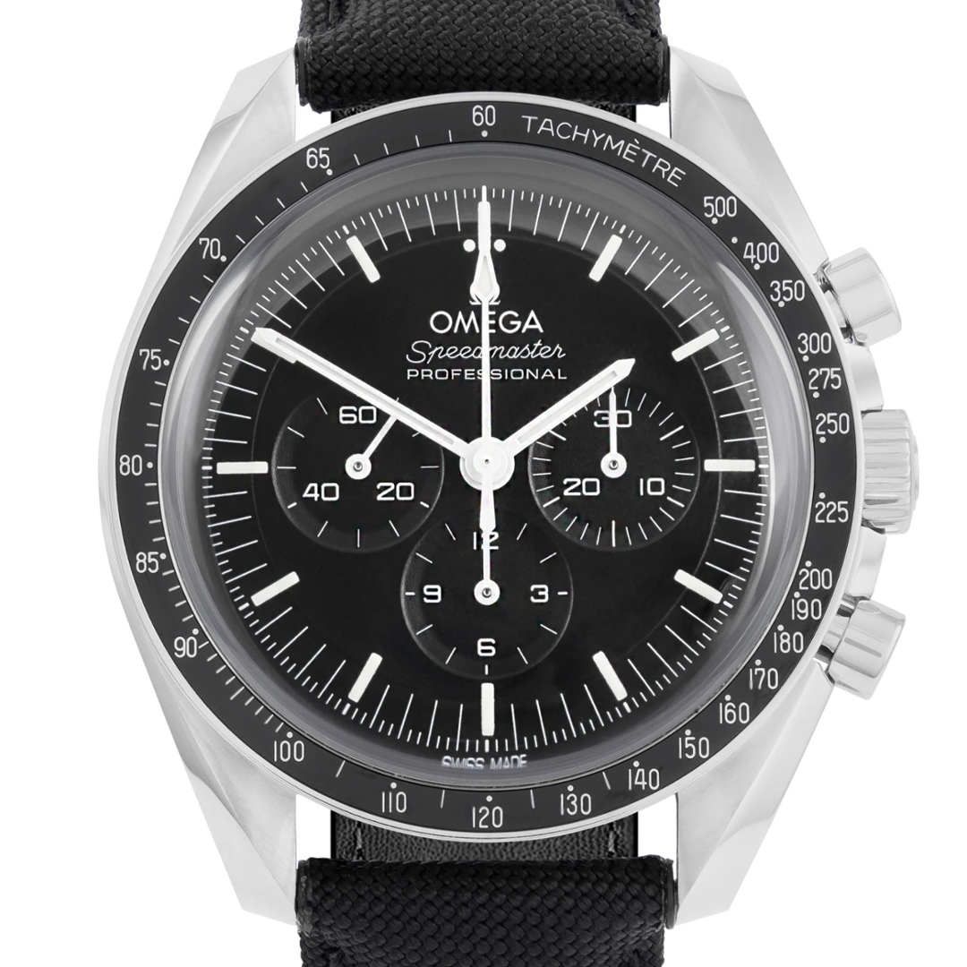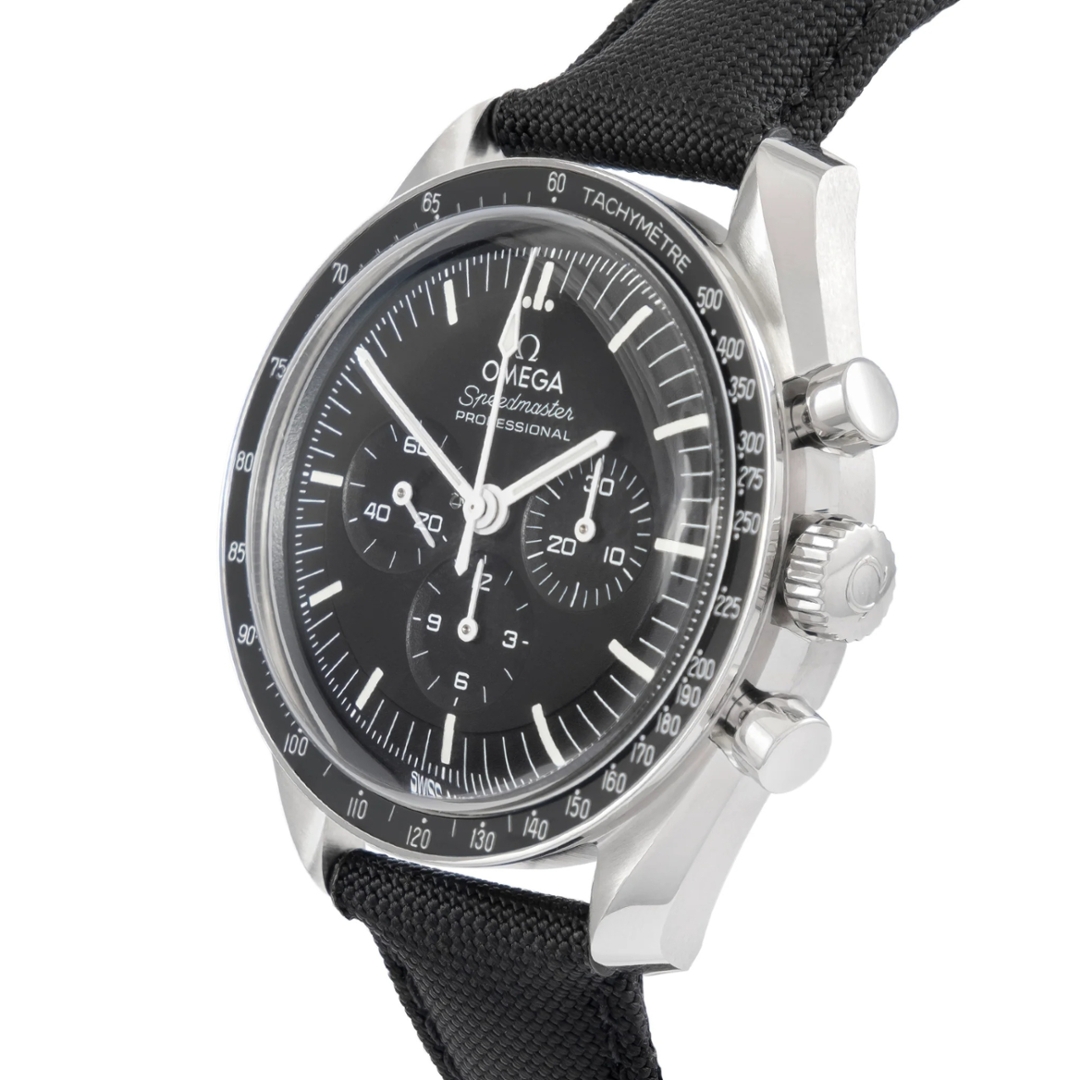 An Omega Speedmaster Moonwatch Professional, presented in stainless steel with a classic black dial and tachymetre bezel, paired with a black strap for a clean and purposeful finish. The 42mm case retains the iconic proportions that have defined the Speedmaster for generations, while the tri-compax chronograph layout and crisp white markers ensure exceptional legibility. This design remains virtually unchanged from the model worn during historic space missions, reinforcing its enduring appeal.