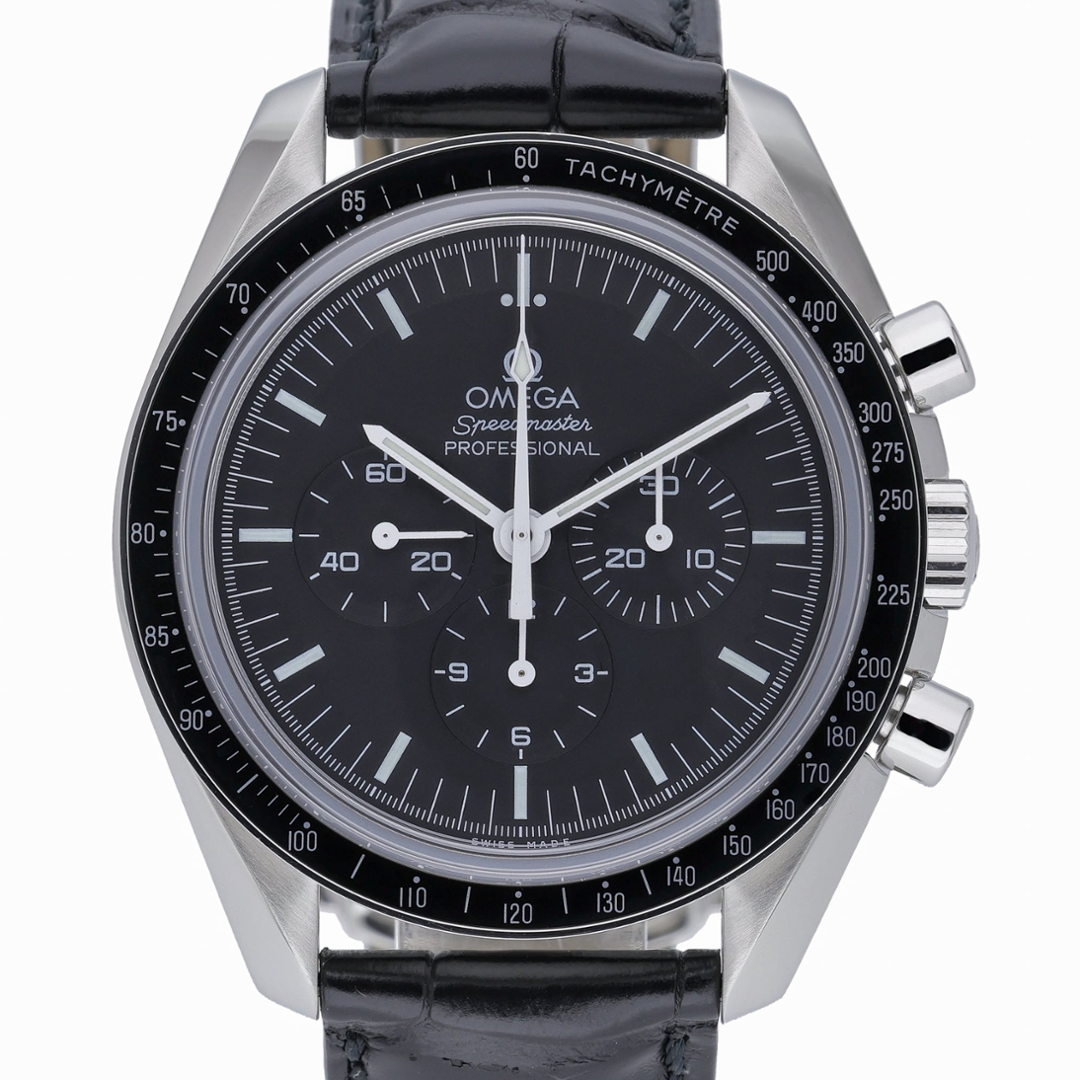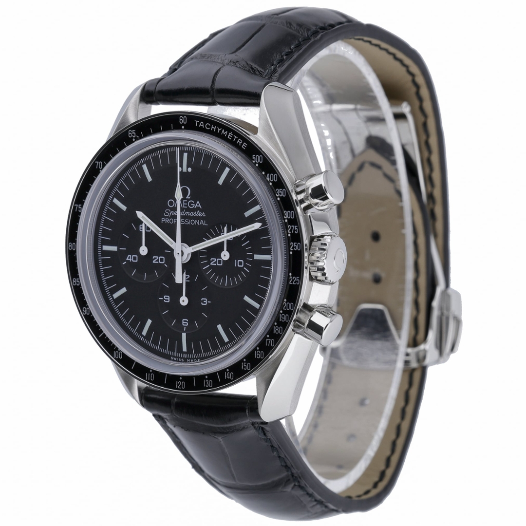 An Omega Speedmaster Moonwatch Professional watch, model 311.33.42.30.01.002, presented on a black leather strap with a stainless steel case and clasp. The 42mm case is complemented by a black tachymetre bezel and matching black dial, delivering the instantly recognisable Moonwatch aesthetic. Featuring luminous baton hour markers, three chronograph sub-dials and a Hesalite crystal, this reference stays true to the classic Speedmaster design worn during NASA’s Apollo missions.