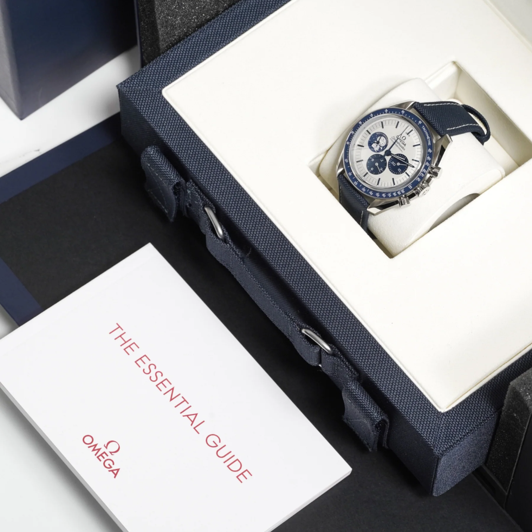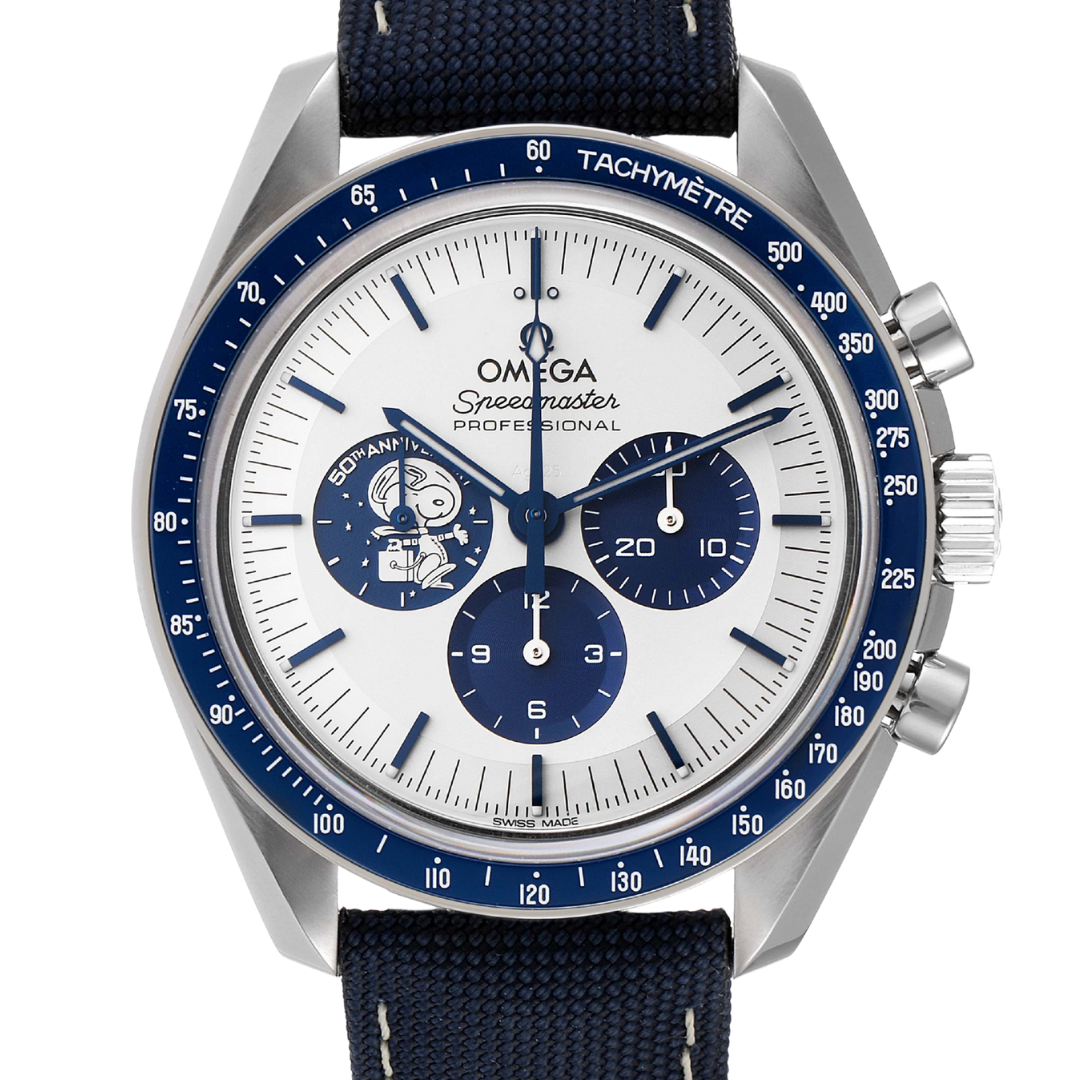 The 42mm stainless steel case houses the manual-wind Calibre 3861, a Master Chronometer movement combining classic Speedmaster architecture with modern anti-magnetic performance. The white dial with blue sub-registers, blue ceramic bezel, and iconic Snoopy motif creates immediate visual distinction while remaining unmistakably Speedmaster. This balance of heritage design and contemporary engineering underpins its long-term collectability.