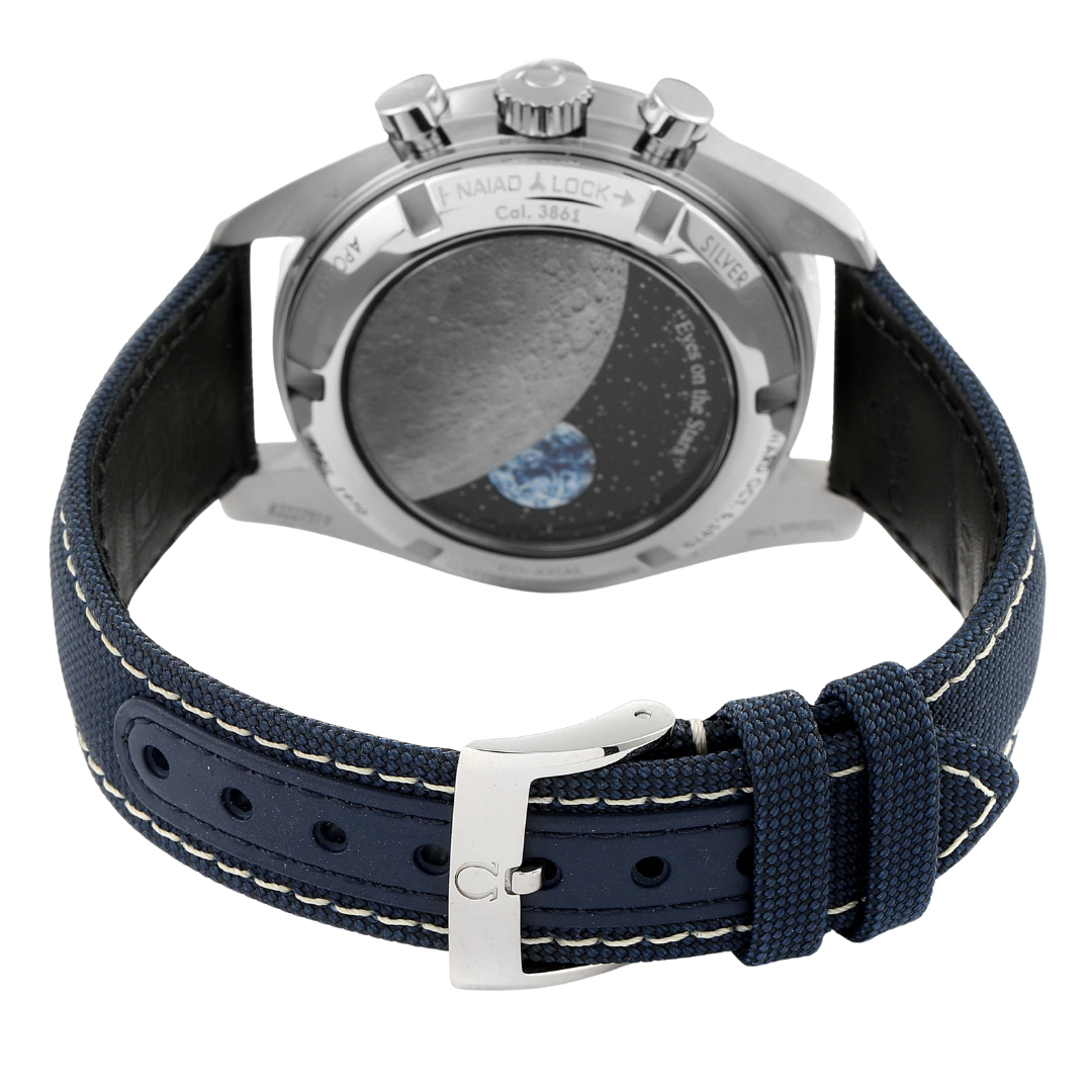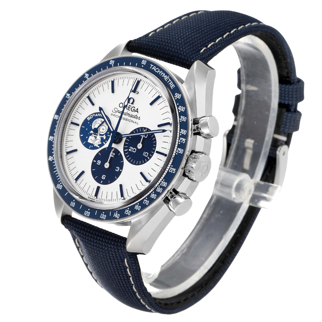 An Omega Speedmaster Anniversary Series (Snoopy) Watch, Blue Leather Strap with a Stainless Steel Case & Clasp and a Blue Bezel on a White Dial