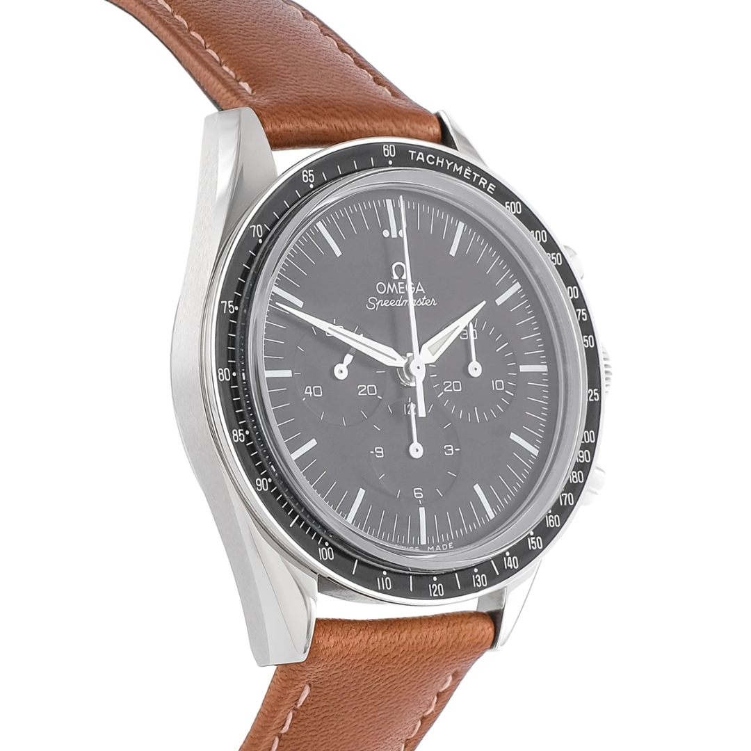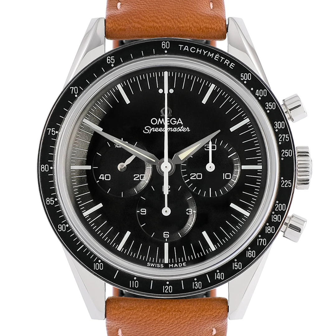 An Omega Speedmaster, presented in stainless steel with a black dial and tachymetre bezel, paired with a brown leather strap for a more vintage-inspired aesthetic. The 40mm case offers slightly more compact proportions than the traditional Moonwatch, while retaining the iconic Speedmaster design language. The classic tri-compax chronograph layout, combined with aged-style hour markers and hands, gives this reference a subtle heritage feel with strong everyday versatility.