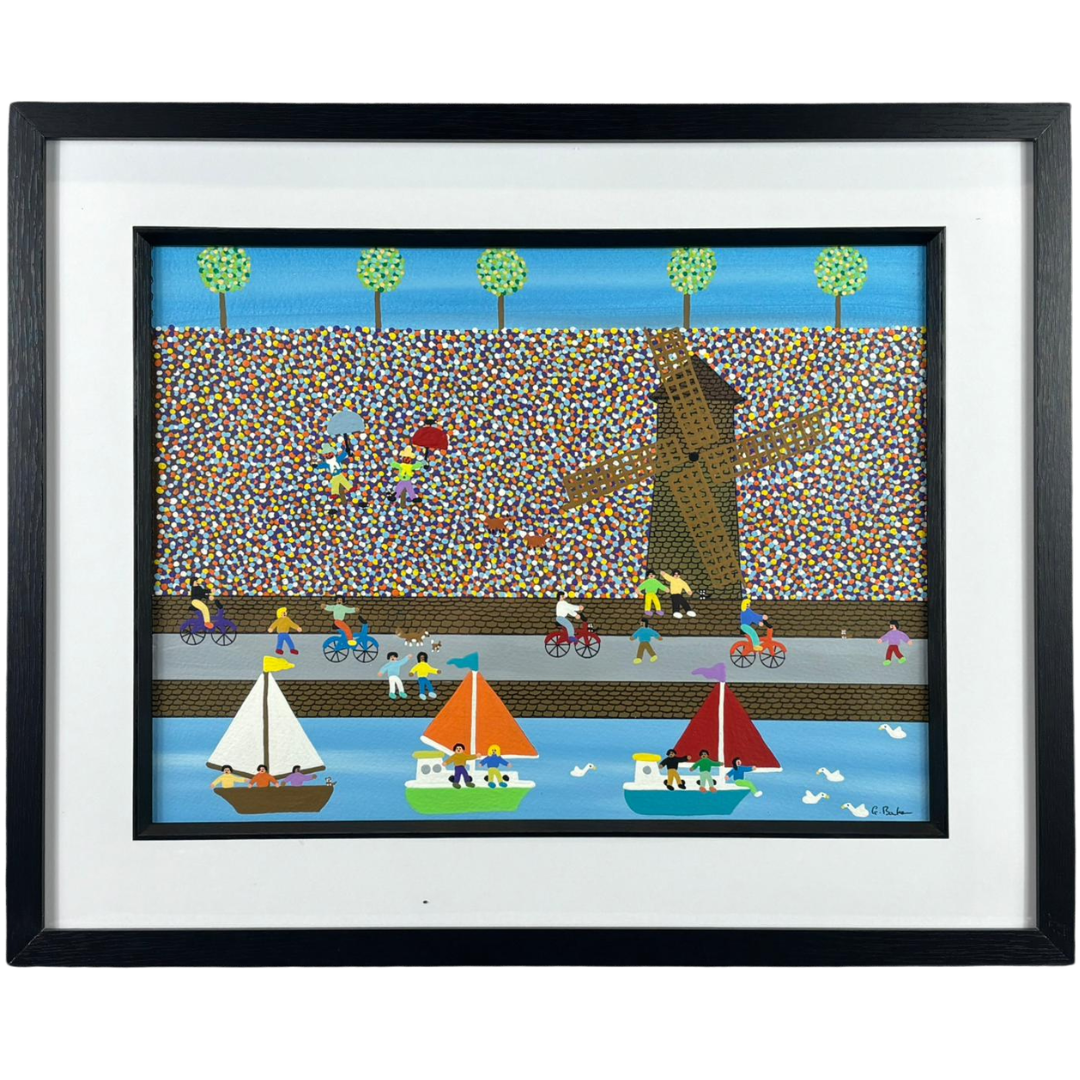 A lively countryside and coastal scene unfolds, centred around a striking windmill set against a richly patterned landscape. Figures stroll, cycle, and interact along a pathway, while below, sailing boats drift across calm waters filled with gentle movement. The artist’s use of bright tones and simplified forms creates a cheerful and whimsical atmosphere, with every element contributing to the narrative.