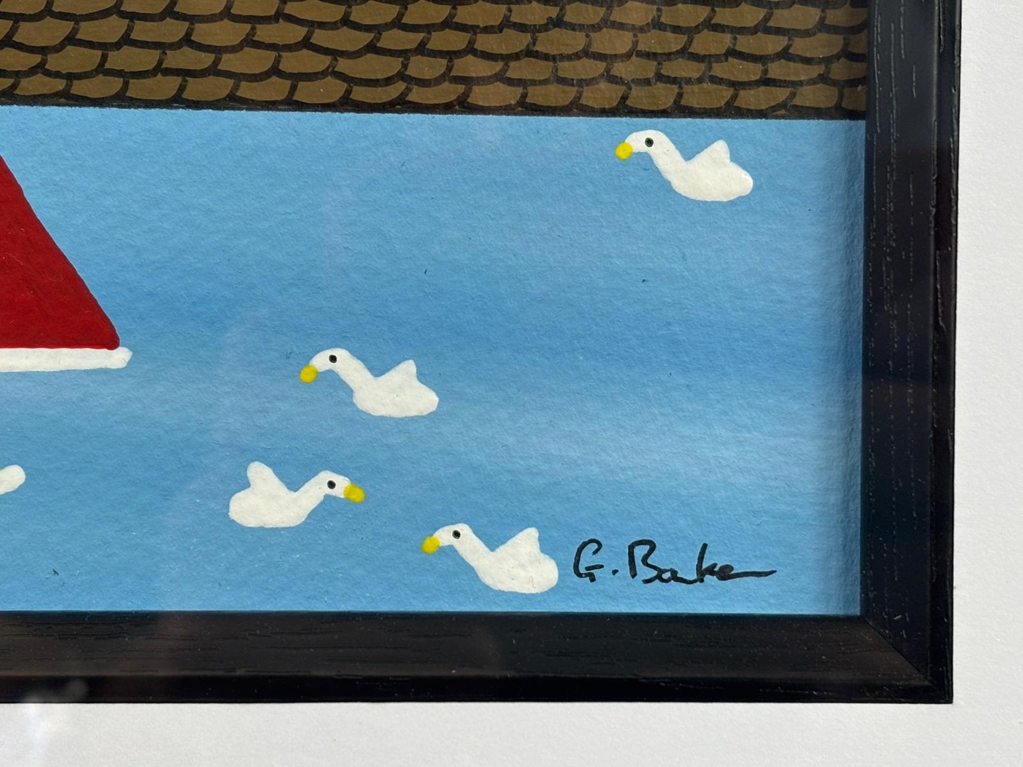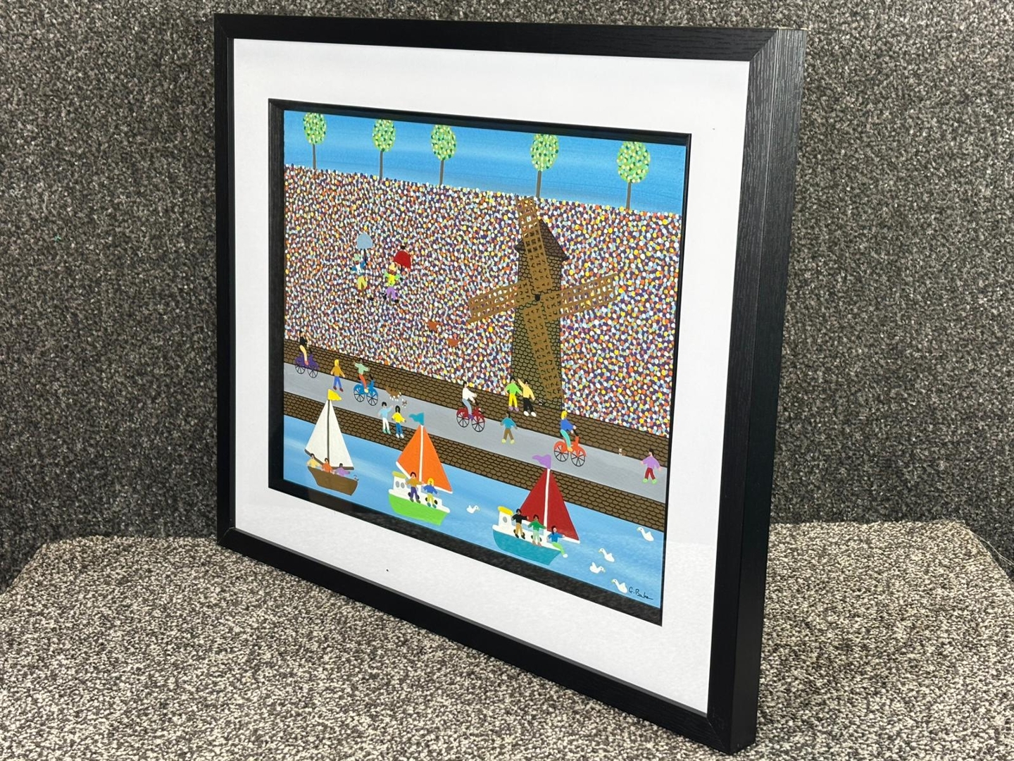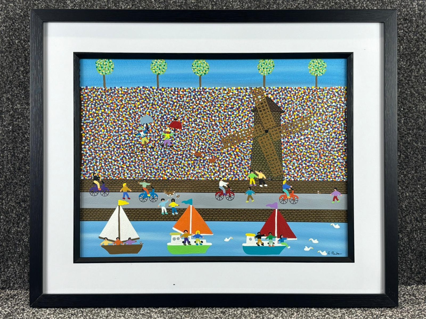 A vibrant original oil painting by British artist Gordon Barker, titled ‘A Day By The Windmill’, presented in a smart black frame with mount and measuring approximately 43cm in height and 53cm in width. Barker’s distinctive naïve style has been developed over many years, earning him recognition with works held in private and corporate collections worldwide. His paintings are celebrated for their bold colour, charm, and engaging storytelling.