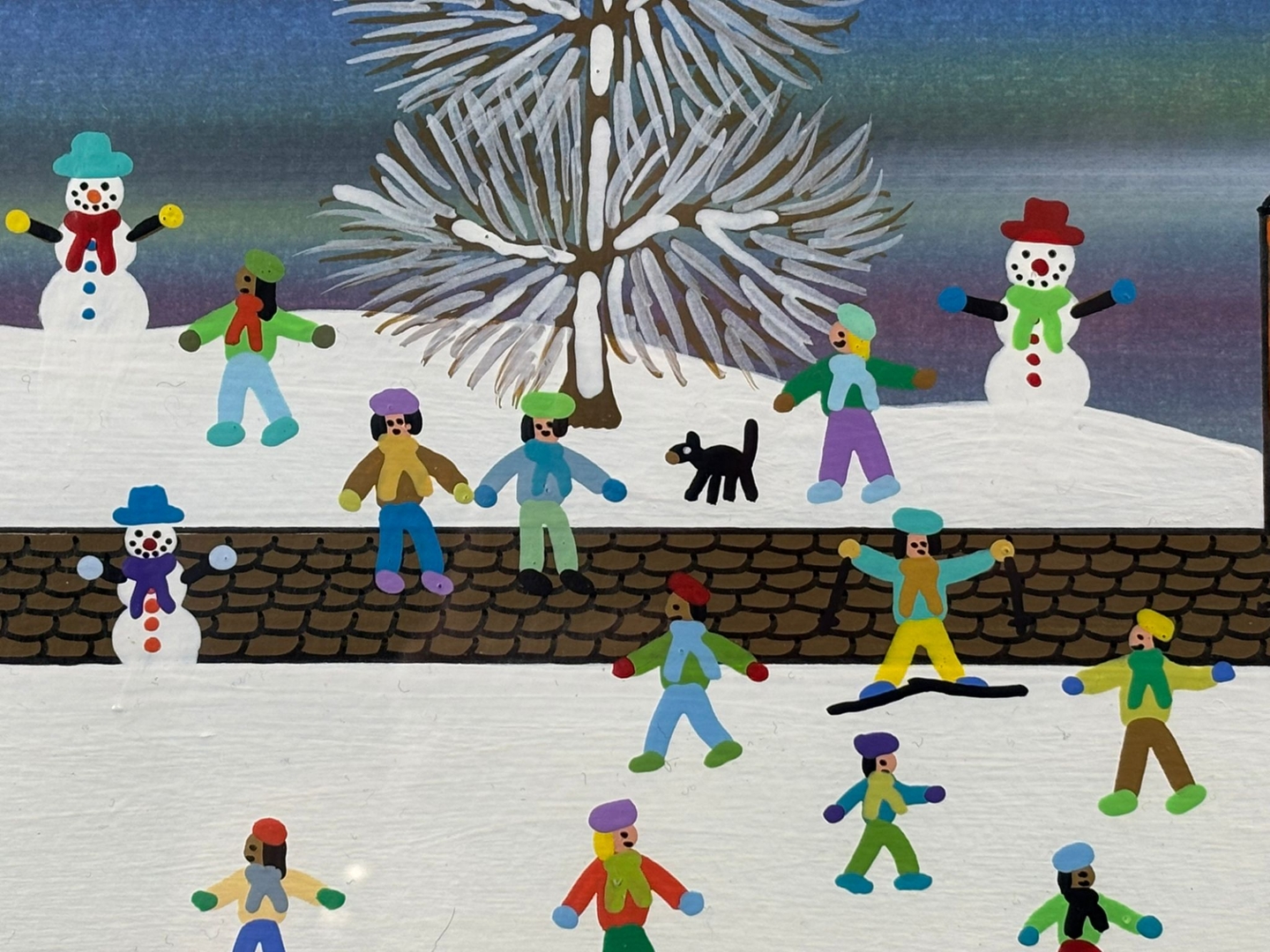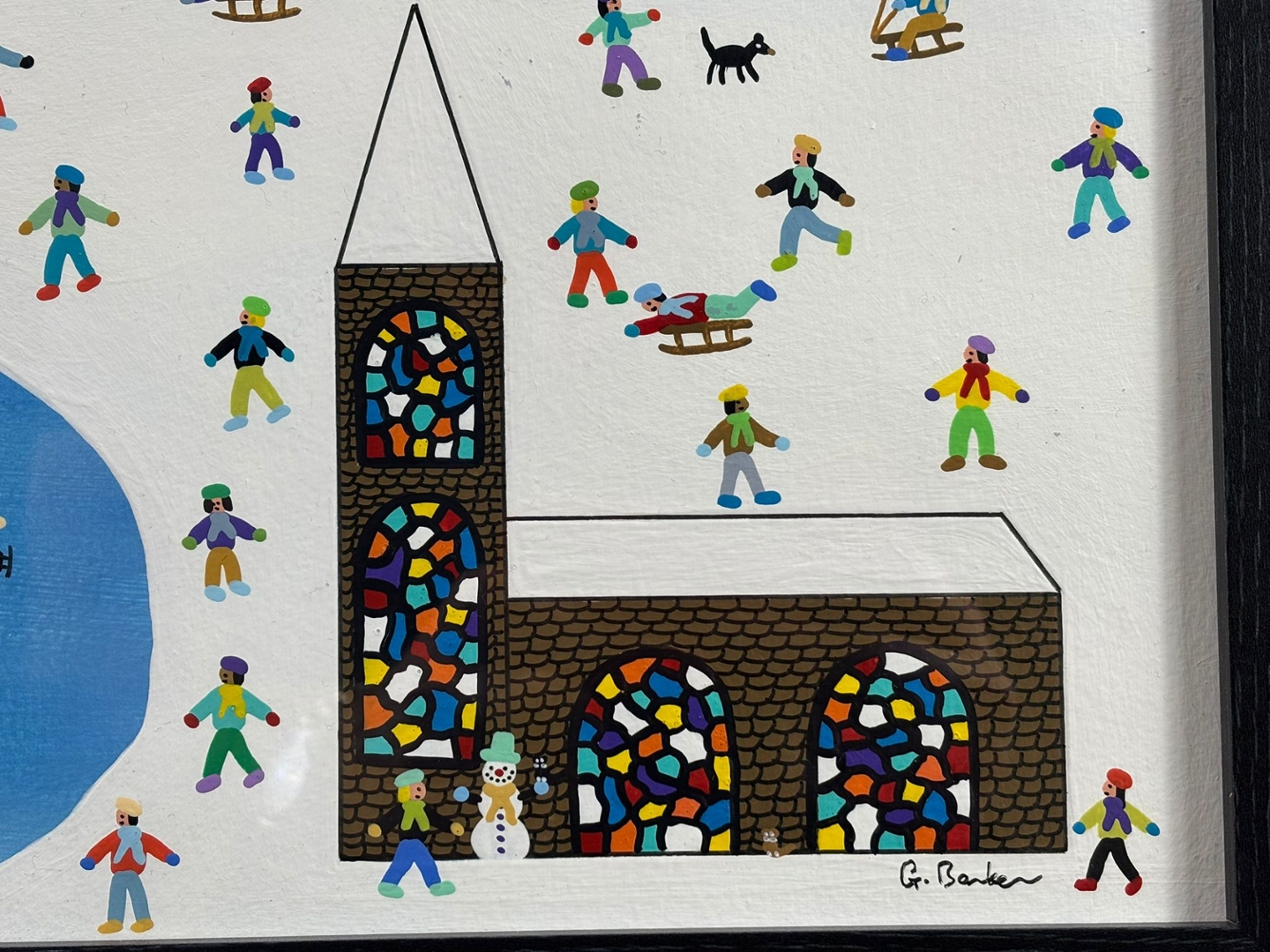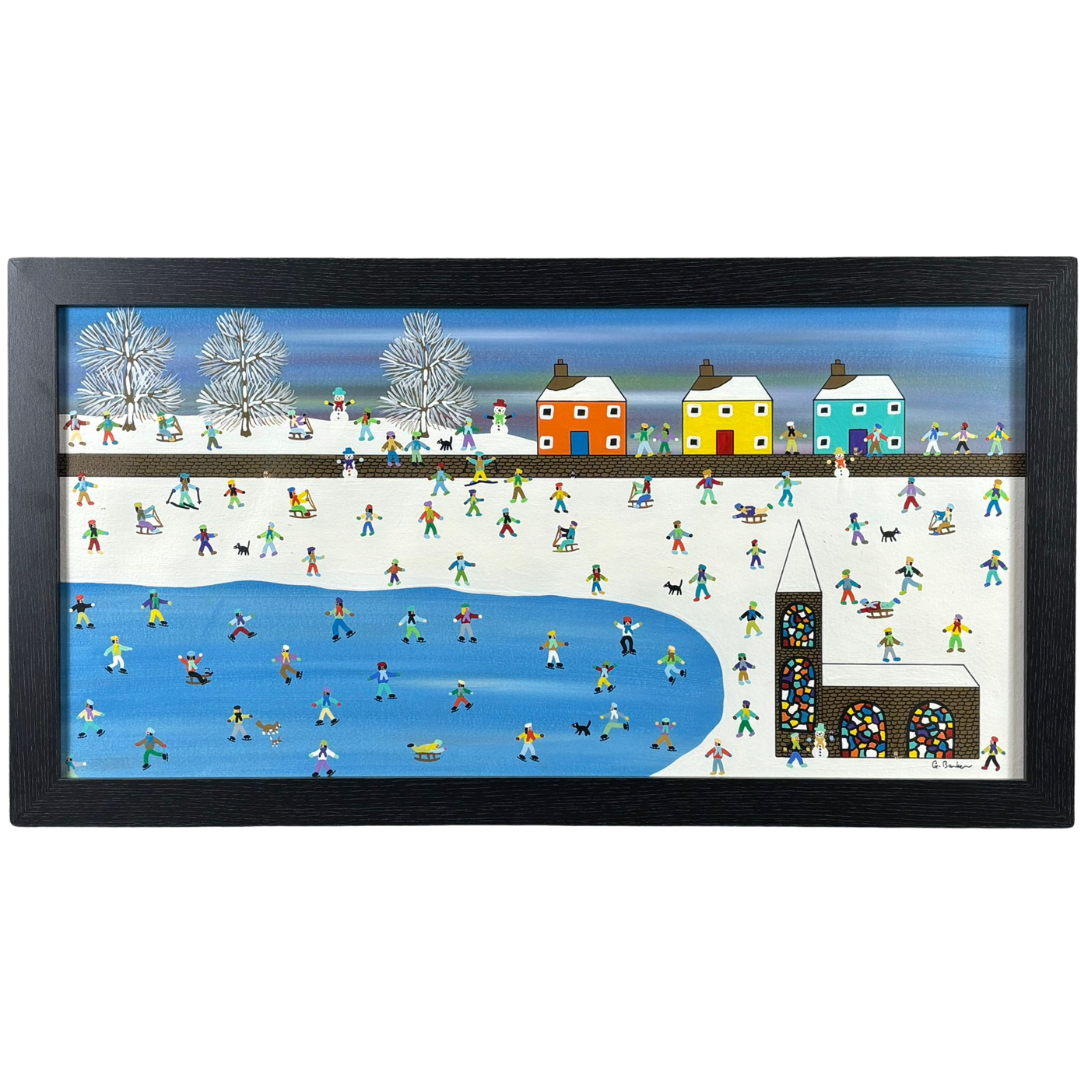 A lively winter scene unfolds across the composition, with skaters gliding across an icy lake, children playing in the snow, and figures dotted throughout the landscape enjoying the crisp day. A row of brightly coloured houses and snow-covered trees lines the background, while a quaint church with stained glass-style windows adds character and depth. The artist’s use of bold colours and simplified forms brings warmth and humour to the frosty setting.