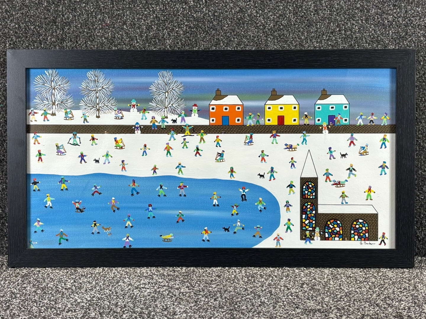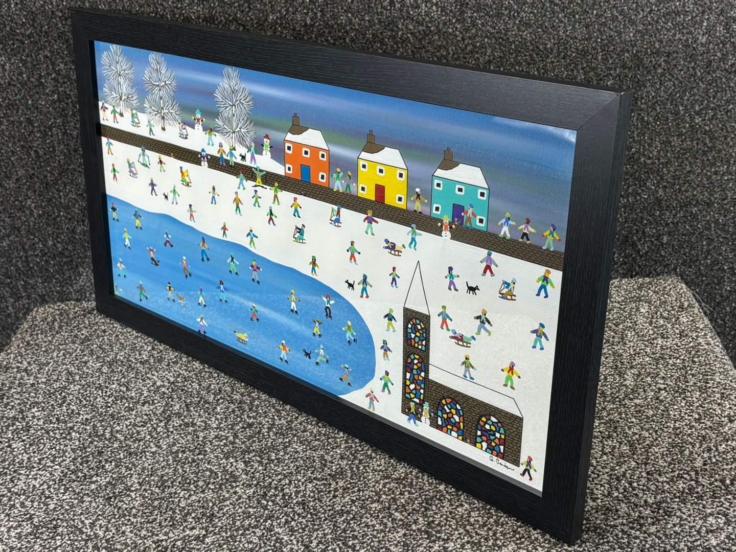 A charming original oil painting by British artist Gordon Barker, titled ‘Another Great Snowy Day’, presented in a sleek black frame and measuring approximately 35cm in height and 65cm in width. Barker’s distinctive naïve style is immediately recognisable, shaped by a lifelong passion for art that began in childhood and evolved into a successful career with works held in private and corporate collections worldwide.