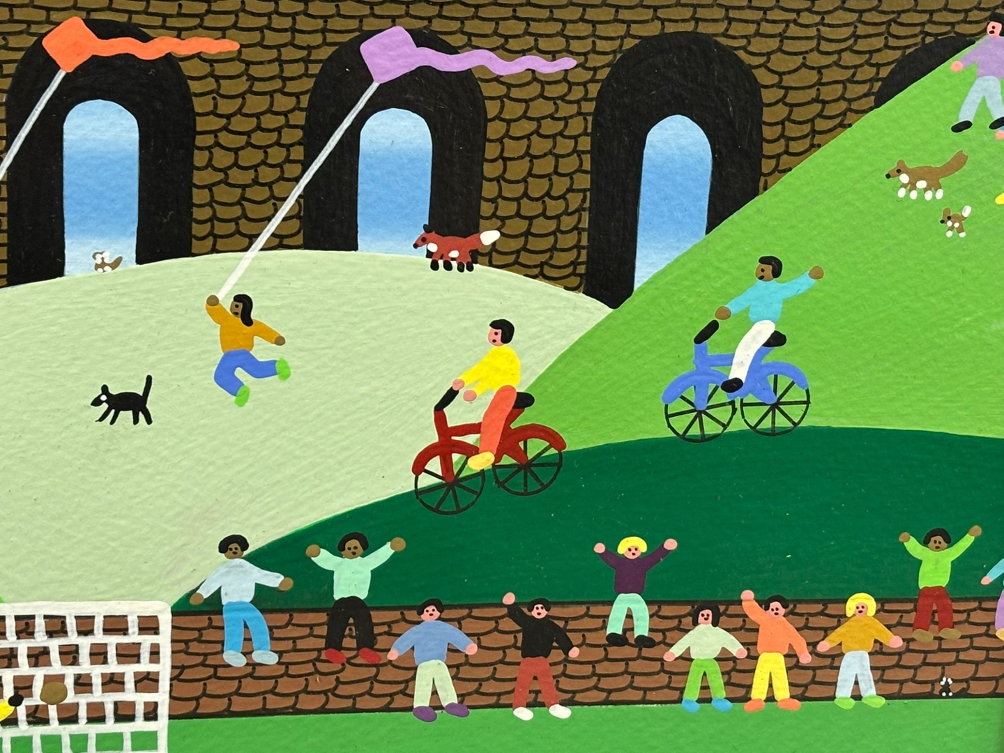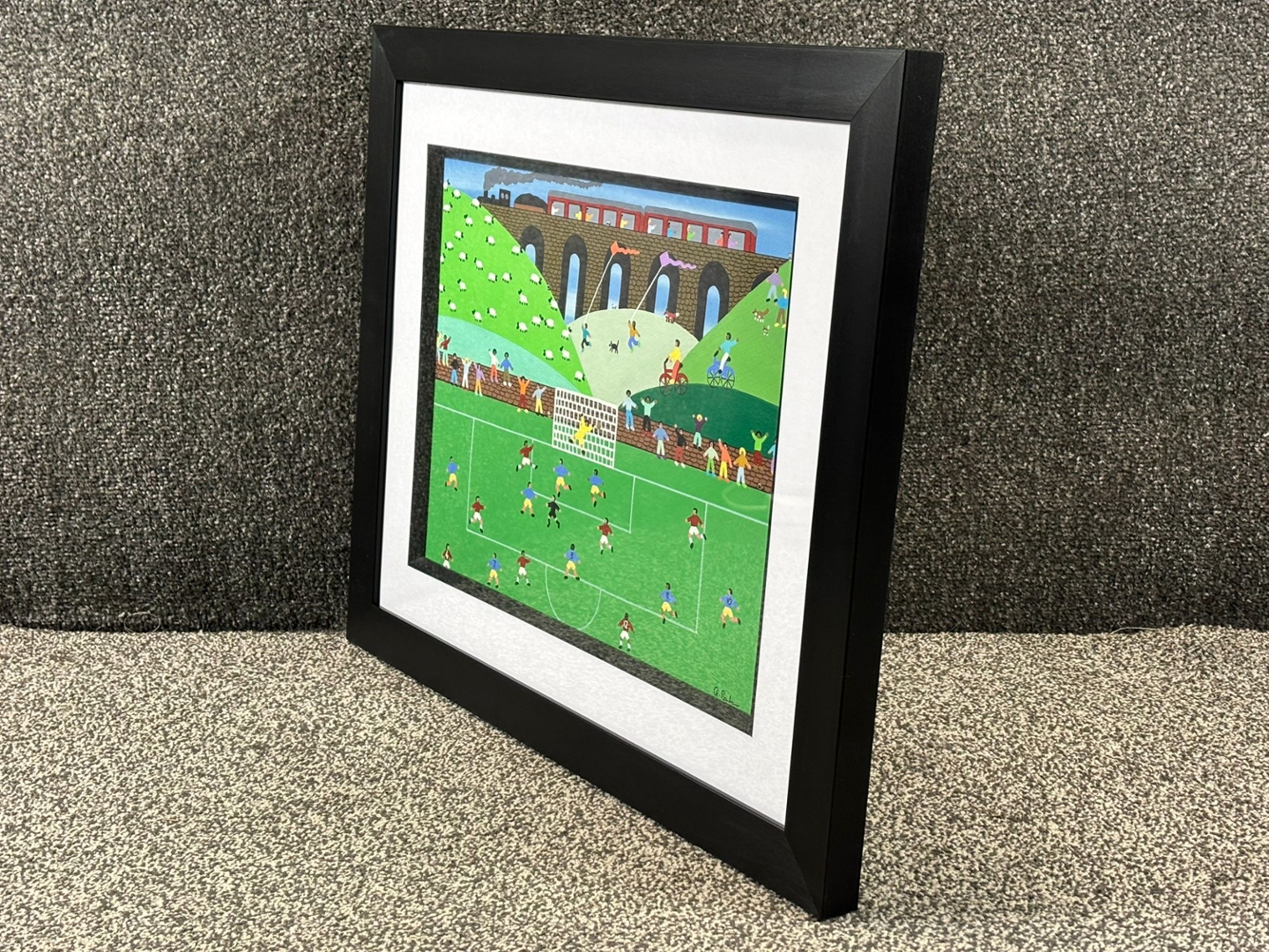 An original oil painting by celebrated artist Gordon Barker, Back Of The Net is a vibrant and energetic portrayal of football fever captured in Barker’s distinctive, colourful style. Measuring approximately 46cm in height and 56cm in width, including its bold black frame, this captivating artwork blends sporting drama with whimsical charm.