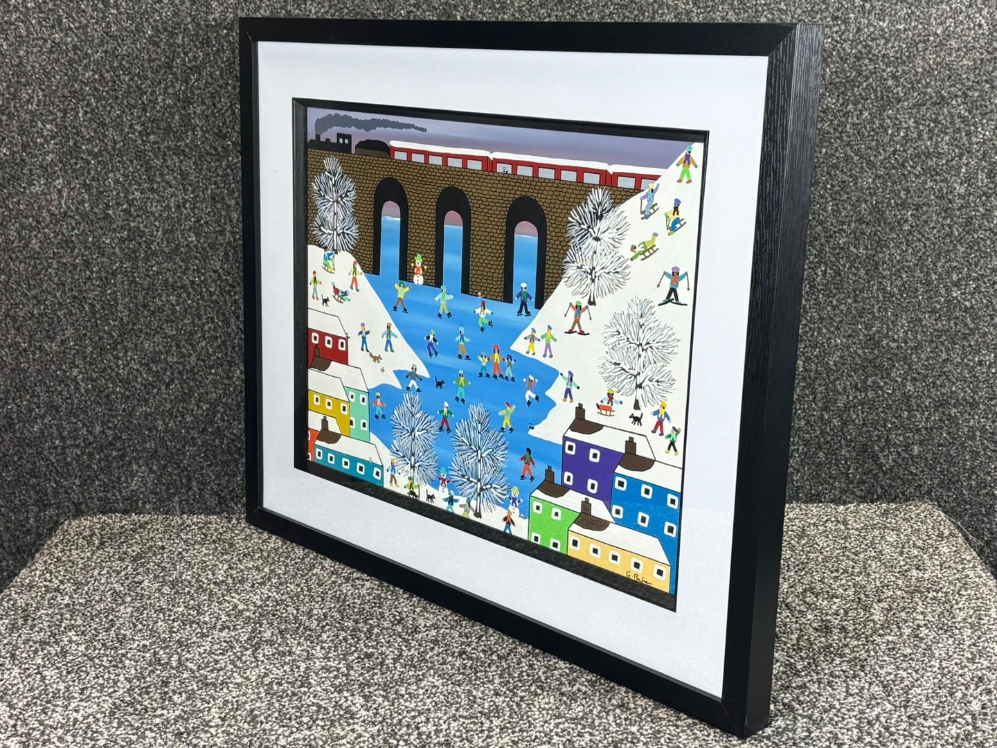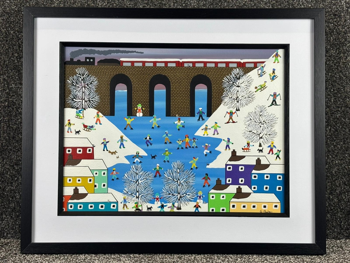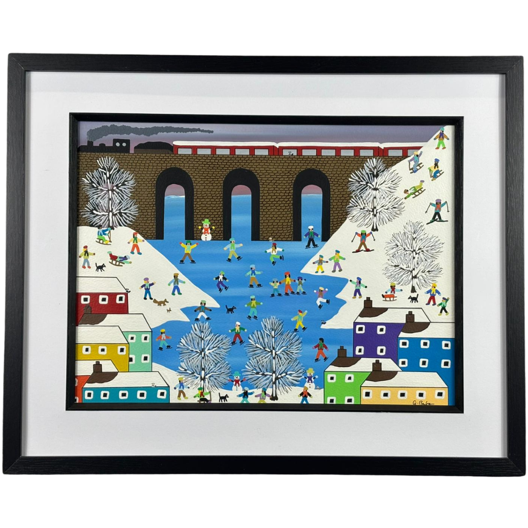 A lively winter scene unfolds around a frozen river, where families and children skate, play, and enjoy the crisp snowy surroundings. A striking stone viaduct spans the background with a train passing overhead, while snow-covered trees and colourful houses frame the composition. The simplified figures and bold palette bring warmth and movement to the frosty setting, capturing a joyful sense of community and seasonal fun.