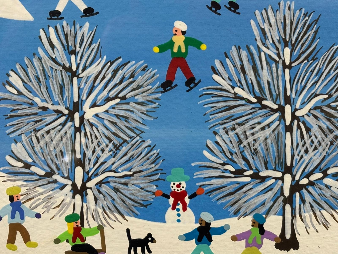 A charming original oil painting by British artist Gordon Barker, titled ‘Family Time Out In The Snow’, presented in a smart black frame with mount and measuring approximately 43cm in height and 53cm in width. Barker’s distinctive naïve style has been developed over many years, with his work now widely collected across private and corporate collections worldwide. His paintings are celebrated for their playful storytelling and instantly recognisable character.