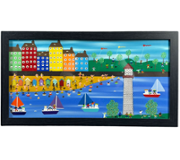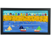 An original oil painting by celebrated British artist Gordon Barker, Fun Bike Race is a joyful explosion of movement, colour, and coastal charm. Measuring approximately 43cm in height and 53cm in width, including its stylish black frame, this dynamic piece showcases Barker’s signature naïve style and exuberant storytelling.