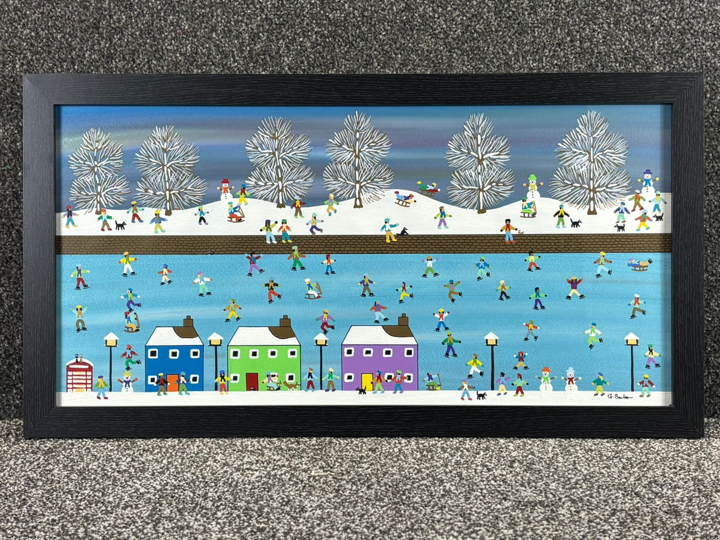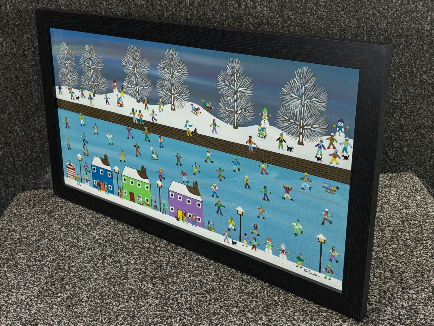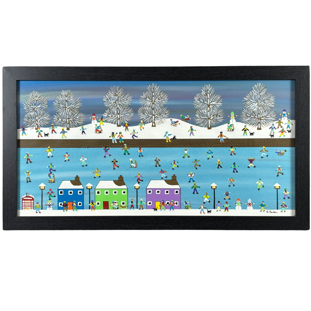 A lively original oil painting by British artist Gordon Barker, titled ‘Ice Skating’, presented in a sleek black frame and measuring approximately 35cm in height and 65cm in width. Barker’s distinctive naïve style has been developed over many years, with his work now featured in private and corporate collections across the world. His paintings are celebrated for their playful storytelling and instantly recognisable charm.