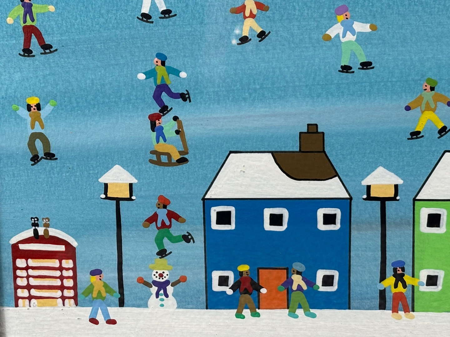 A bustling winter scene stretches across the composition, with dozens of figures skating across a frozen river while others stroll along the snowy banks above. Snow-covered trees create a striking backdrop, while a row of colourful houses in the foreground adds warmth and contrast to the cool tones of the ice. The simple forms, bold colours, and lively arrangement of characters bring movement and humour to the piece.
