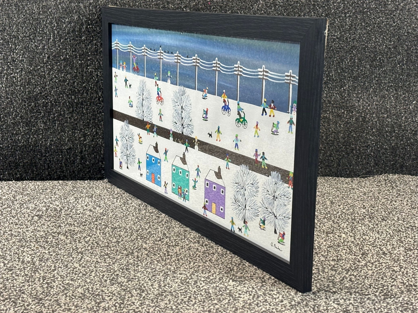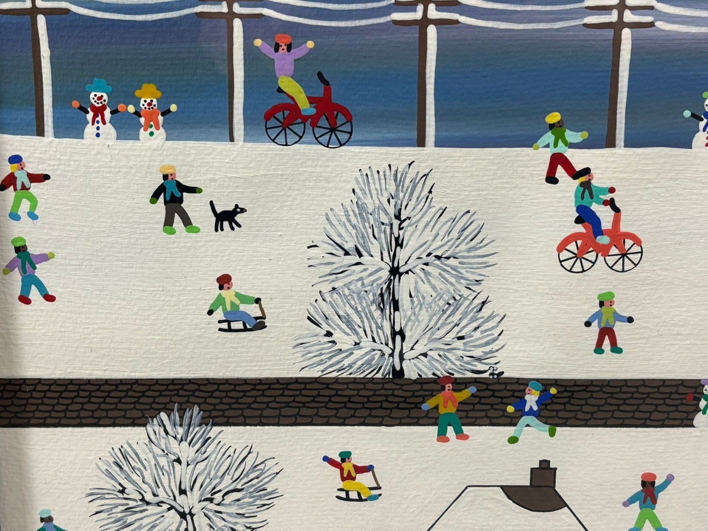 The painting depicts a stylised snowy landscape filled with